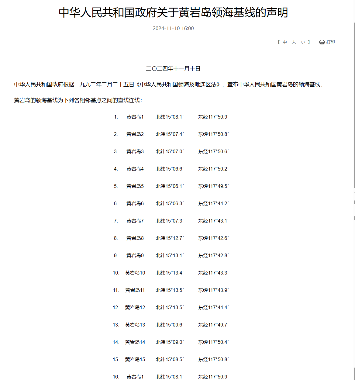 中华人民共和国政府根据一九九二年二月二十五日《中华人民共和国领海及毗连区法》,宣布中华人民共和国黄岩岛的领海基线。