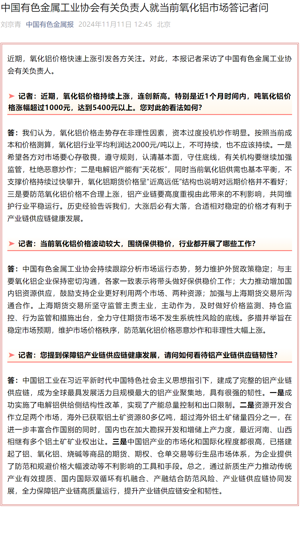 财联社11月11日电,中国有色金属工业协会有关负责人就当前氧化铝市场答记者问:我们认为,氧化铝价格走势存在非理性因素,资本过度投机炒作明显。按照当前成本和价格测算,氧化铝行业平均利润达2000元/吨以上,不可持续,也不应该持续。一是希望各方对市场要心存敬畏,遵守规则,认清基本面,守住底线,有关机构要继续加强监管,杜绝恶意炒作;二是电解铝产能有“天花板”,同时当前氧化铝供需也基本平衡,不支撑价格持续过快攀升,氧化铝期货价格呈“近高远低”结构也说明对远期价格并不看好;三是要防范氧化铝价格不合理上涨,铝产业链要高度重视由此带来的不利影响,共同维护行业平稳运行。历史经验告诉我们,大涨后必有大落,合适相对稳定的价格才有利于产业链供应链健康发展。