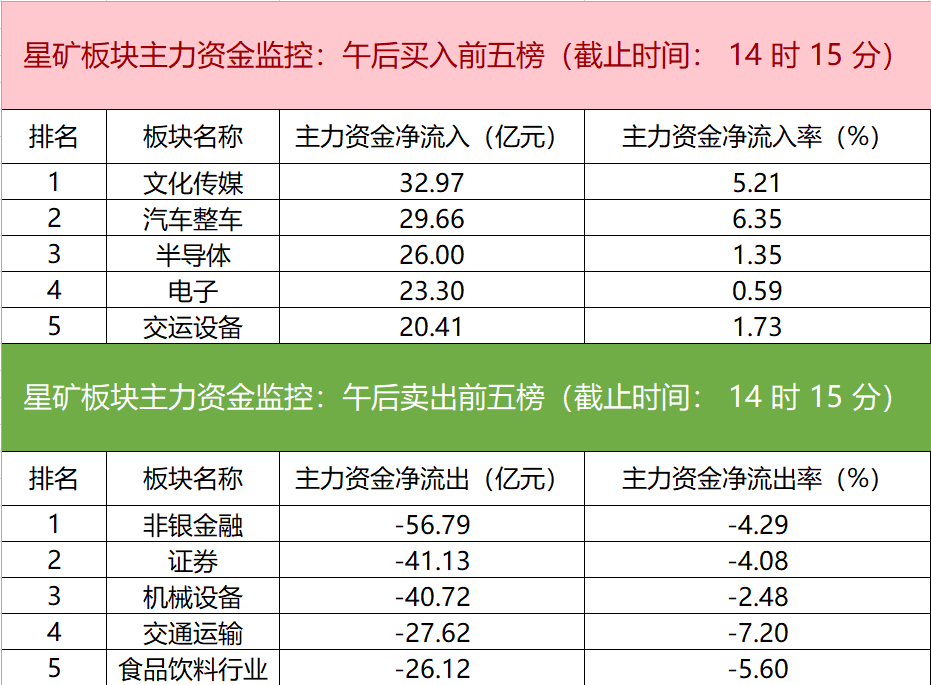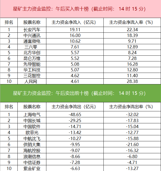 财联社11月11日电,财联社星矿数据显示,今日主力资金净流入文化传媒、汽车整车、半导体等板块,净流出非银金融、证券、机械设备等板块,其中非银金融板块净流出56.79亿元。个股方面,长安汽车涨停,主力资金净流入19.11亿元居首位,中兴通讯、通富微电、三六零获主力资金净流入居前;上海电气遭净卖出48.65亿元居净流出首位,中国长城、中国软件、欧菲光等主力资金净流出额居前。