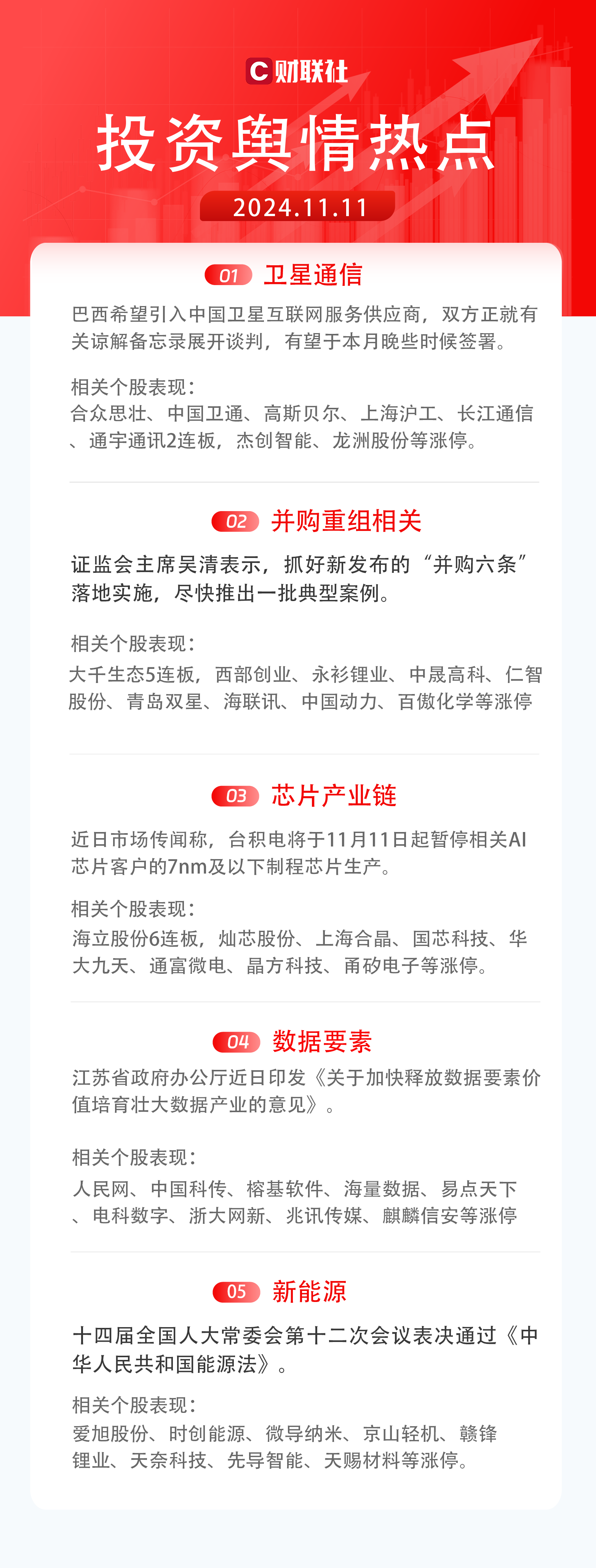 5)新能源:十四届全国人大常委会第十二次会议表决通过《中华人民共和国能源法》。