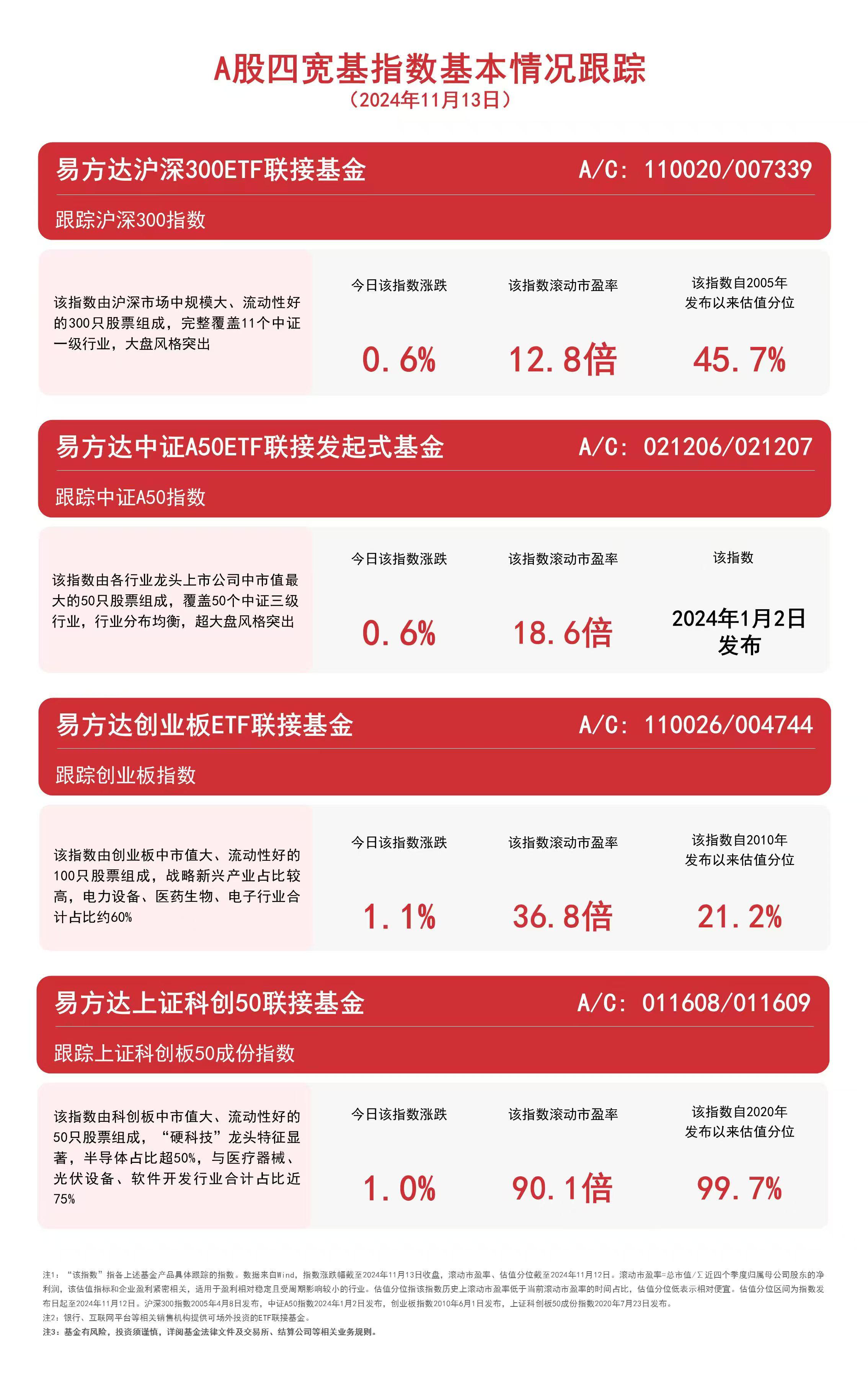 A股四宽基指数低开高走,易方达沪深300ETF联接基金(A/C: 110020/007339)等产品布局核心资产