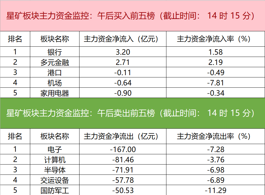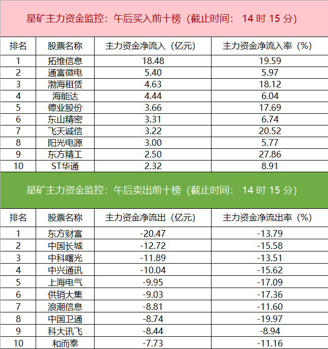 财联社11月14日电,财联社星矿数据显示,今日主力资金净流入银行和多元金融板块,净流出电子、计算机、半导体等板块,其中电子板块净流出167.00亿元。个股方面,拓维信息大涨,主力资金净流入18.48亿元居首位,通富微电、渤海租赁、海能达获主力资金净流入居前;东方财富遭净卖出20.47亿元居净流出首位,中国长城、中科曙光、中兴通讯等主力资金净流出额居前。
