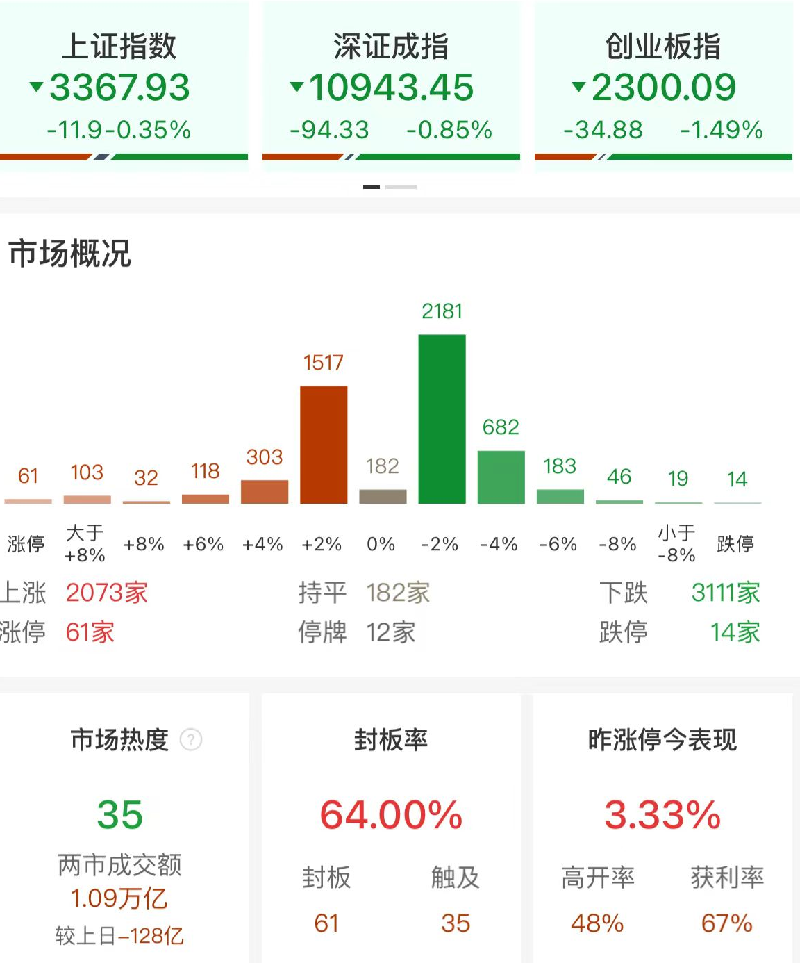 财联社11月15日电,市场早盘延续调整,创业板指领跌。沪深两市半日成交额1.09万亿,较上个交易日缩量128亿。盘面上,AI应用方向逆势爆发,福石控股、天娱数科、金财互联、中科金财等涨停。消费电子概念股震荡走强,朝阳科技、奥海科技、明月镜片等涨停。固态电池概念股局部活跃,有研新材、传艺科技、红豆股份等涨停。下跌方面,芯片股持续调整,通富微电跌超7%;光伏概念股震荡走低,沐邦高科跌停。总体上个股跌多涨少,全市场超3100只个股下跌。板块方面,Sora概念、智谱AI、教育、消费电子等板块涨幅居前,半导体、光伏设备、军工装备、农业等板块跌幅居前。截至收盘,沪指跌0.35%,深成指跌0.85%,创业板指跌1.49%。