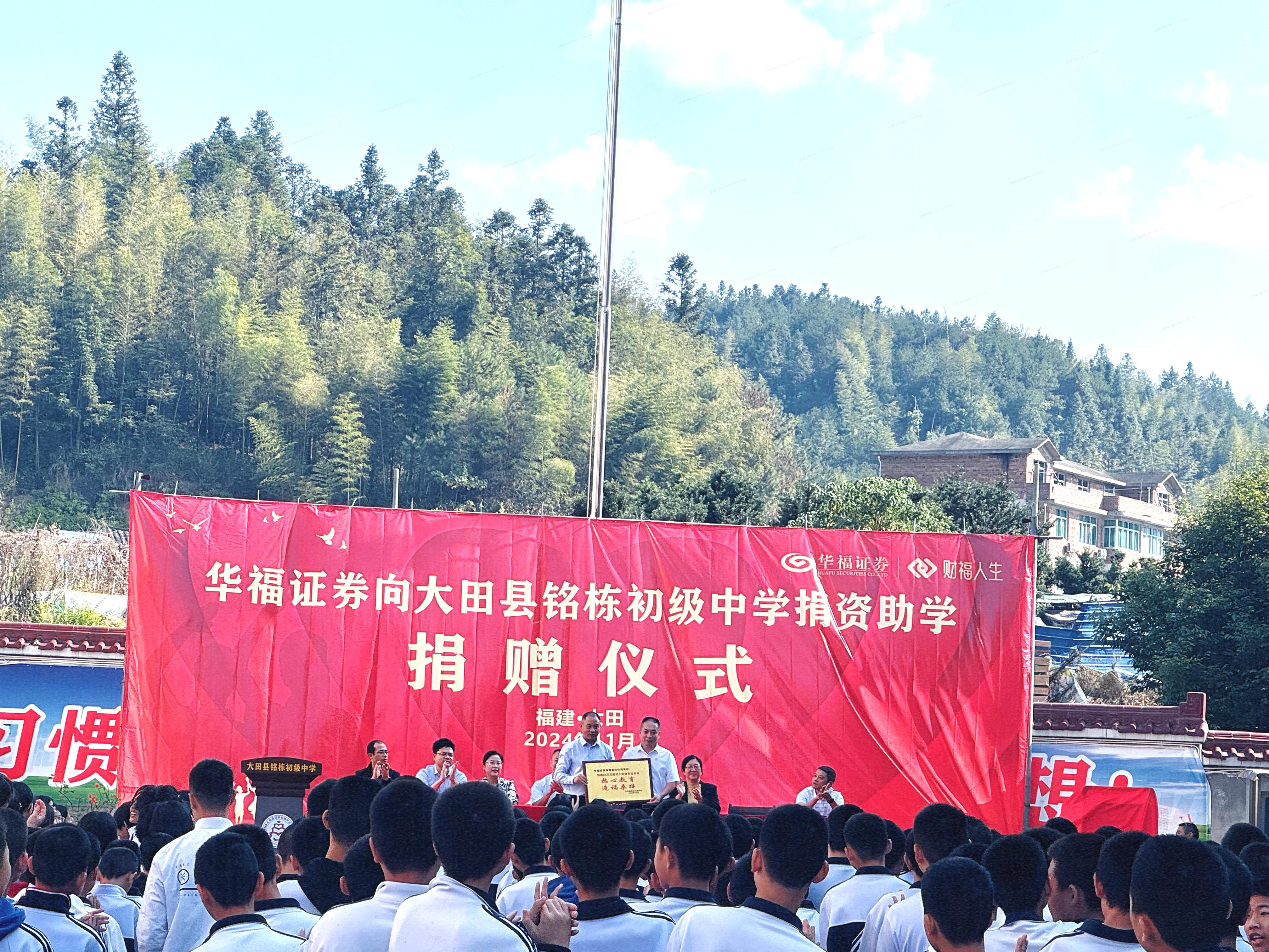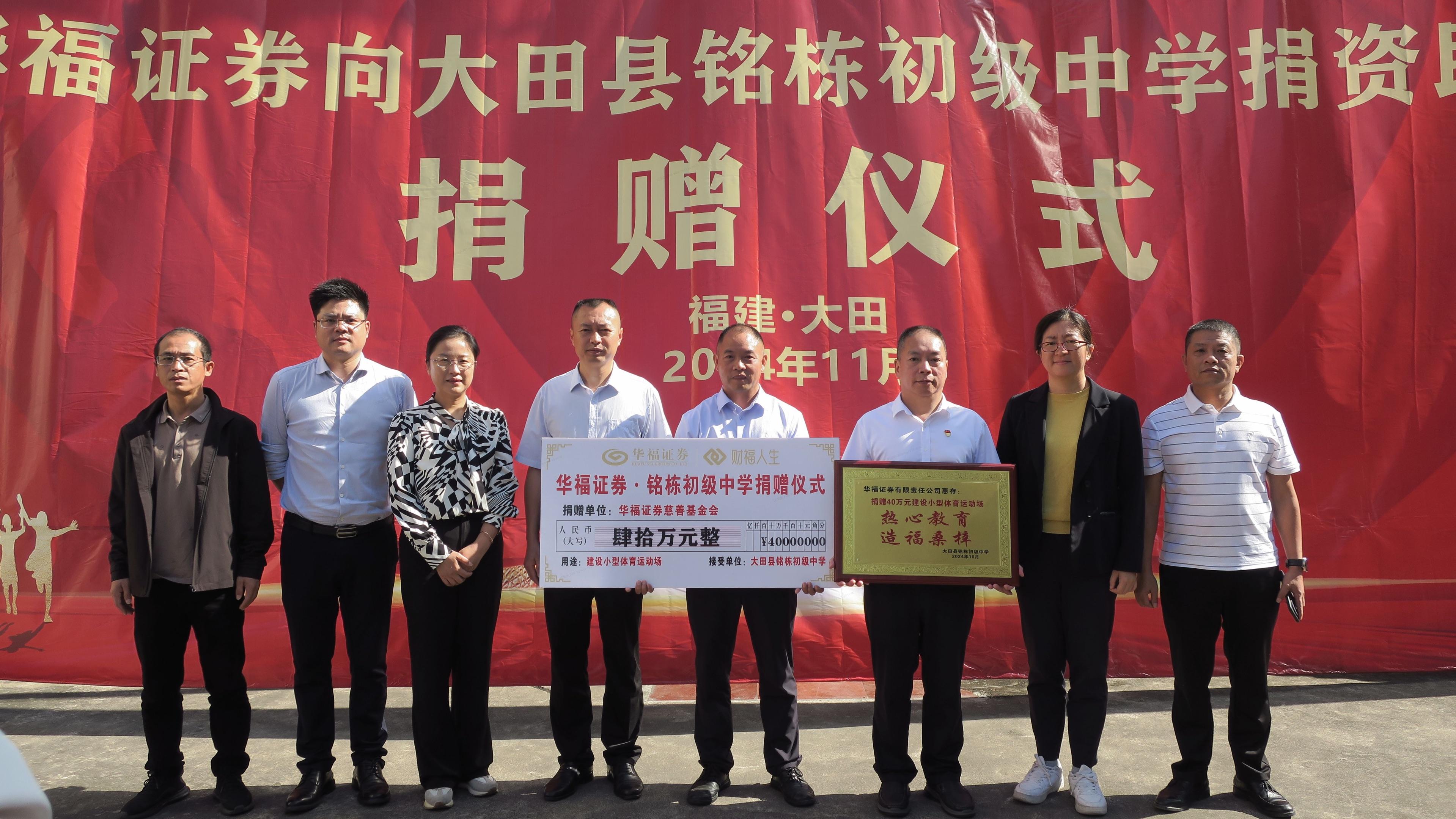 本次华福证券为大田铭栋初级中学捐赠40万元,用于修建小型运动场,此次捐赠不仅为学校带来了实质性的改变,更彰显了华福证券对教育事业的深厚情感和坚定支持。