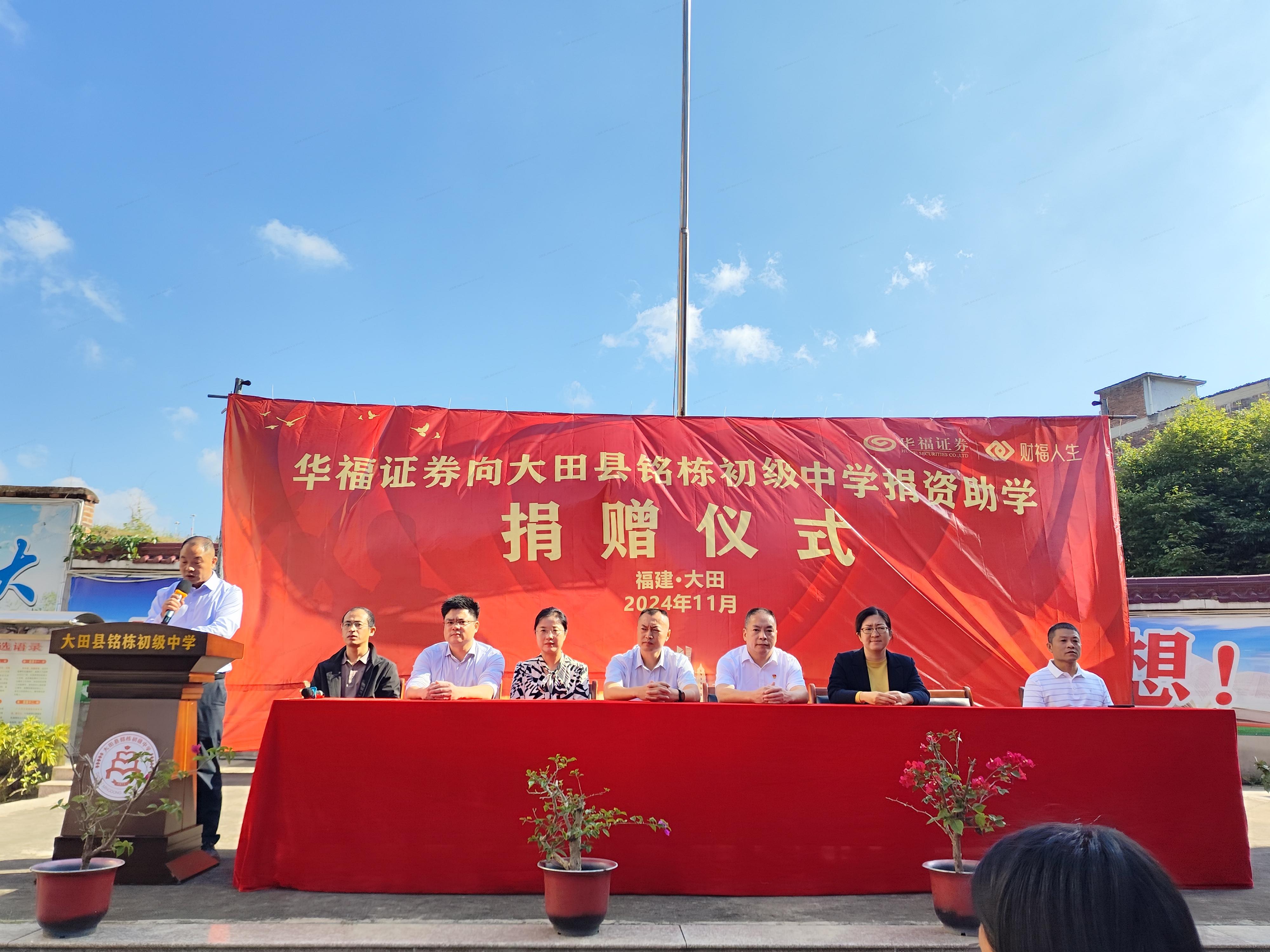 为弘扬公益慈善精神,传递社会正能量,推动乡村教育事业的发展,2024年11月6日,华福证券三明分公司在大田县铭栋初级中学举办捐赠仪式。华福证券三明分公司副总经理章进新、综合运营部总经理王宝纯、大田营业部负责人温振奋、广平镇人大主席余成建、教育局副局长陈娟及学校全体师生参加捐赠仪式。