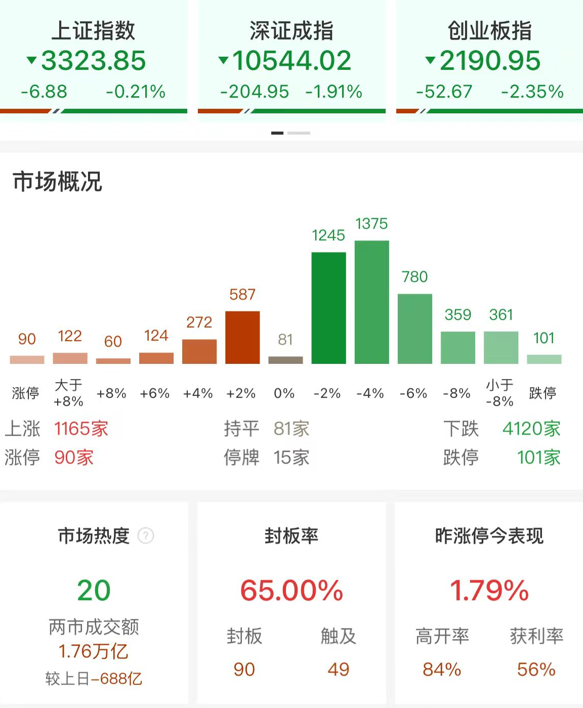 财联社11月18日电,市场全天冲高回落,创业板指领跌收3连阴,近三个交易日跌超9%。全市场超4100只个股下跌,逾200股跌超9%。沪深两市全天成交额1.76万亿,较上个交易日缩量688亿。盘面上,破净股逆势爆发,钢铁、银行、中字头等多个方向走强,中南股份、永泰能源、上海建工、交运股份等涨停。房地产板块震荡走强,世荣兆业、电子城、金融街、黑牡丹等多股涨停。石墨电极概念股开盘大涨,宁新新材、东方碳素、杉杉股份、宝泰隆涨停。低空经济概念股尾盘异动,中信海直、四川九洲、宗申动力涨停。下跌方面,AI应用方向集体大跌,豆神教育等多股跌超10%;华为概念股震荡走低,银邦股份午后跳水跌停。板块方面,石墨电极、银行、钢铁、房地产等板块涨幅居前,智谱AI、软件开发、游戏、鸿蒙概念等板块跌幅居前。截至收盘,沪指跌0.21%,深成指跌1.91%,创业板指跌2.35%。