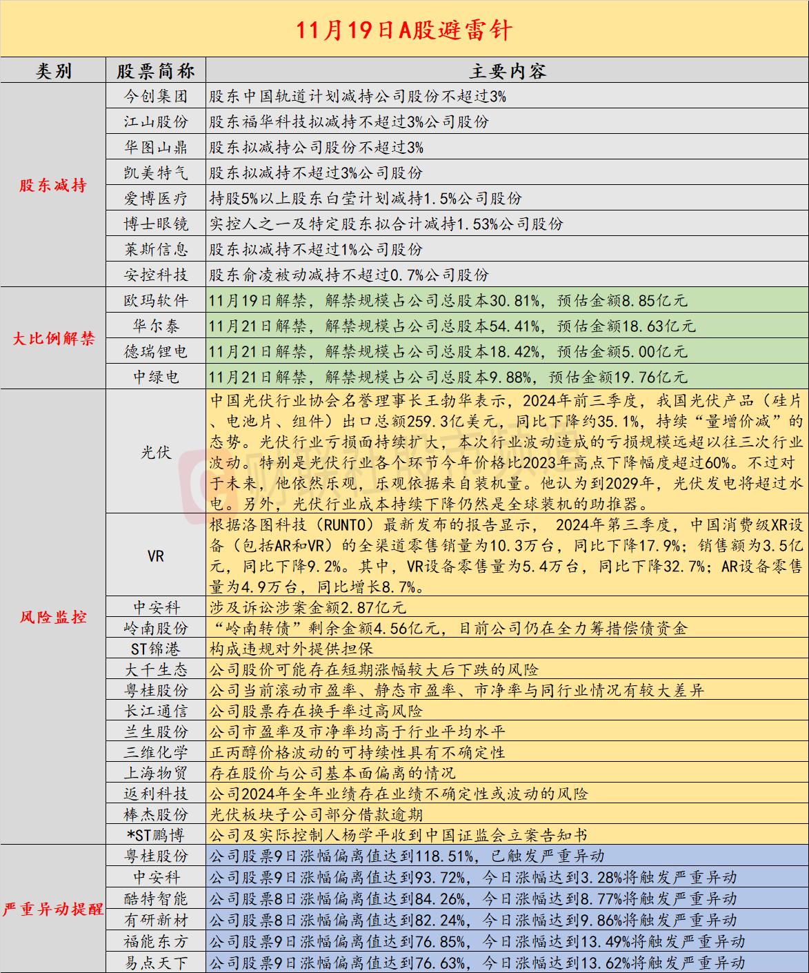 昨日公告的A股拟减持的公司数量较之前有所减少,今创集团股东中国轨道计划减持公司股份不超过3%,江山股份股东福华科技拟减持不超过3%公司股份;欧玛软件、华尔泰将迎来超三成以上解禁;中国光伏行业协会名誉理事长表示,本次行业波动造成的亏损规模远超以往三次行业波动;8天7板中安科公告,公司证券虚假陈述责任纠纷案涉案金额2.87亿元;机构报告显示,Q3中国消费级XR设备的全渠道零售销量为10.3万台,同比下降17.9%;2连板岭南股份表示“岭南转债”剩余金额4.56亿元,目前公司仍在全力筹措偿债资金;美国司法部将推动谷歌出售Chrome,以打破垄断。