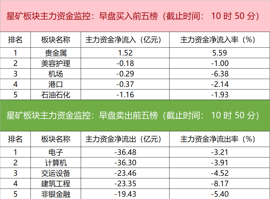 财联社11月19日电,财联社星矿数据显示,今日早盘主力资金仅净流入贵金属板块,净流出电子、计算机、交运设备等板块,其中电子板块净流出超36亿元。个股方面,海能达一度涨停,主力资金净买入7.20亿元位居首位,拓斯达、中国长城、双成药业获主力资金净流入居前;东方财富遭净卖出超7亿元,永泰能源、维信诺、中芯国际主力资金净流出额居前。