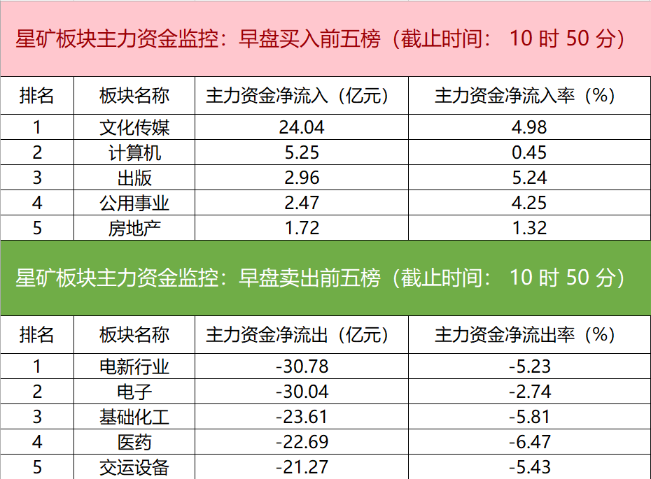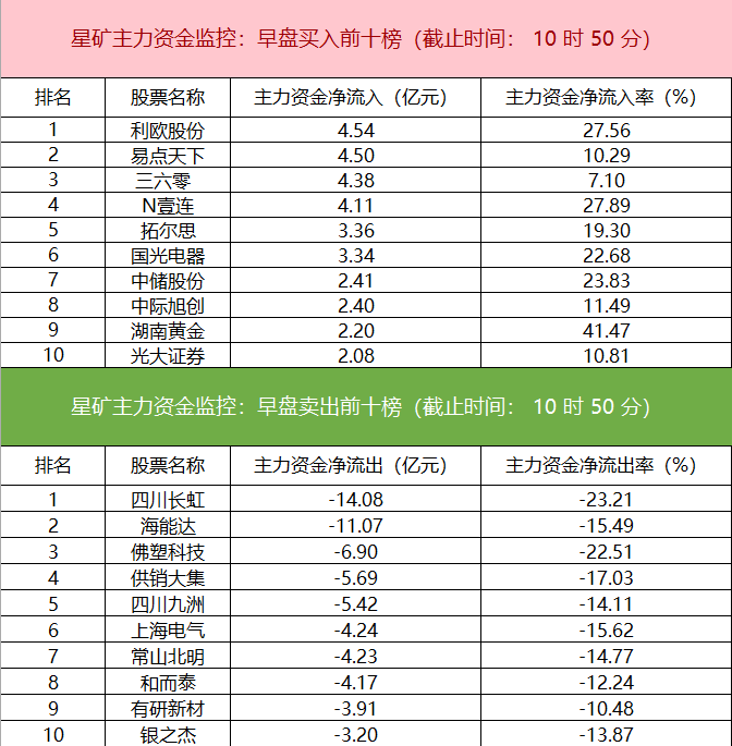 财联社11月22日电,财联社星矿数据显示,今日主力资金净流入文化传媒、计算机、出版等板块,净流出电新行业、电子、基础化工等板块,其中电新行业净流出30.78亿元。个股方面,利欧股份涨停,主力资金净流入4.54亿元居首位,易点天下、三六零、N壹连获主力资金净流入居前;四川长虹遭净卖出14.08亿元居净流出首位,海能达、佛塑科技、供销大集等主力资金净流出额居前。