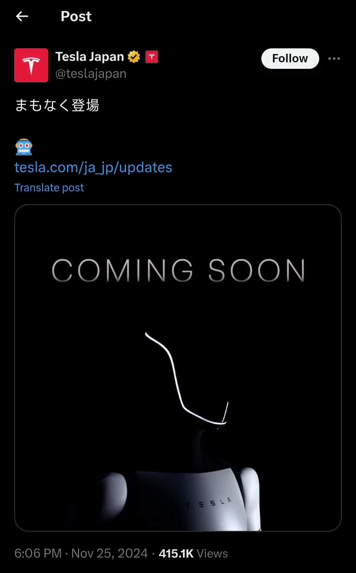 《科创板日报》26日讯,11月25日,特斯拉日本官方账号在社交平台发布最新动态称,机器人将很快登场。