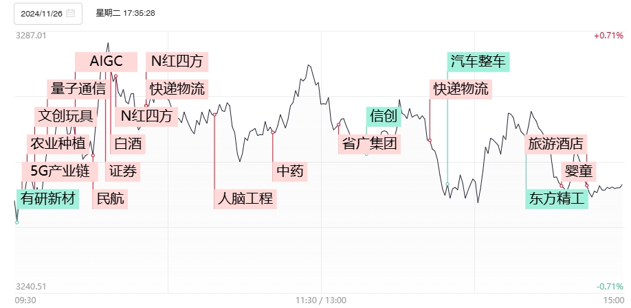 财联社11月27日电,市场全天震荡调整,创业板指领跌,高位股集体大跌,东方精工等上演“天地板”,全市场逾百股跌超9%。沪深两市全天成交额1.3万亿,较前日缩量1852亿,成交额创9月27日以来新低。1)随着年末消费旺季的到来,为进一步激发市场活力,提振消费信心,全国各地纷纷启动新一轮消费券发放活动,以实际行动促进消费回暖。大消费板块全天逆势活跃,食品、酒类股桂发祥、好想你、一鸣食品、皇台酒业等纷纷涨停。受到相关政策面利好的婴童以及旅游概念午后逆势冲高,贝因美、大连圣亚、西安饮食等强势涨停。2)多家机构发布研报认为,“谷圈文化”的崛起,已经成为一股不可忽视的新消费力量,未来将撑起千亿规模市场。文创IP概念为首的谷子经济概念早盘继续爆发,广博股份、实丰文化、奥飞娱乐、华立科技实现连板晋级,两只低位20CM个股创源股份、德艺文创也双双冲板。3)国家知识产权局最新信息显示,华为取得了两项关于量子科技方面的专利。量子通信概念股持续发酵,吉大正元、星光股份一字涨停实现连板晋级,广哈通信、达华智能等纷纷涨停。4)据不完全统计,11月以来,近50家上市公司发布并购重组公告,远超去年同期的仅7家水平,此外近期北京、天津等地的市值管理以及并购重组座谈会等政策层出不穷。并购重组概念局部亮点不断,两只南京本地国资股南京化纤、南京商旅继续一字涨停晋级。