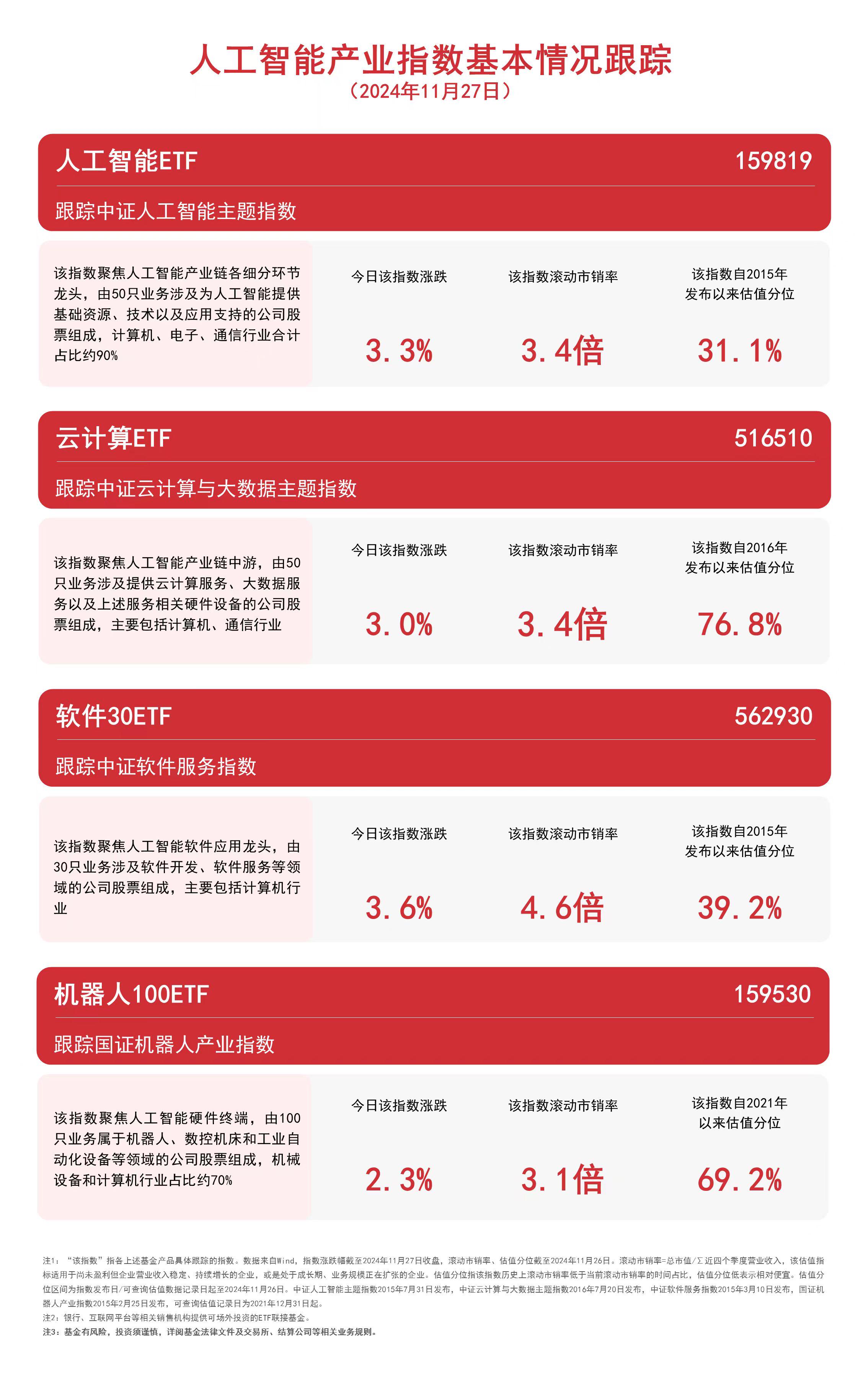 财联社11月27日电,截至收盘,今日中证软件服务指数上涨3.6%,中证人工智能主题指数上涨3.3%,中证云计算与大数据主题指数上涨3.0%,国证机器人产业指数上涨2.3%。
