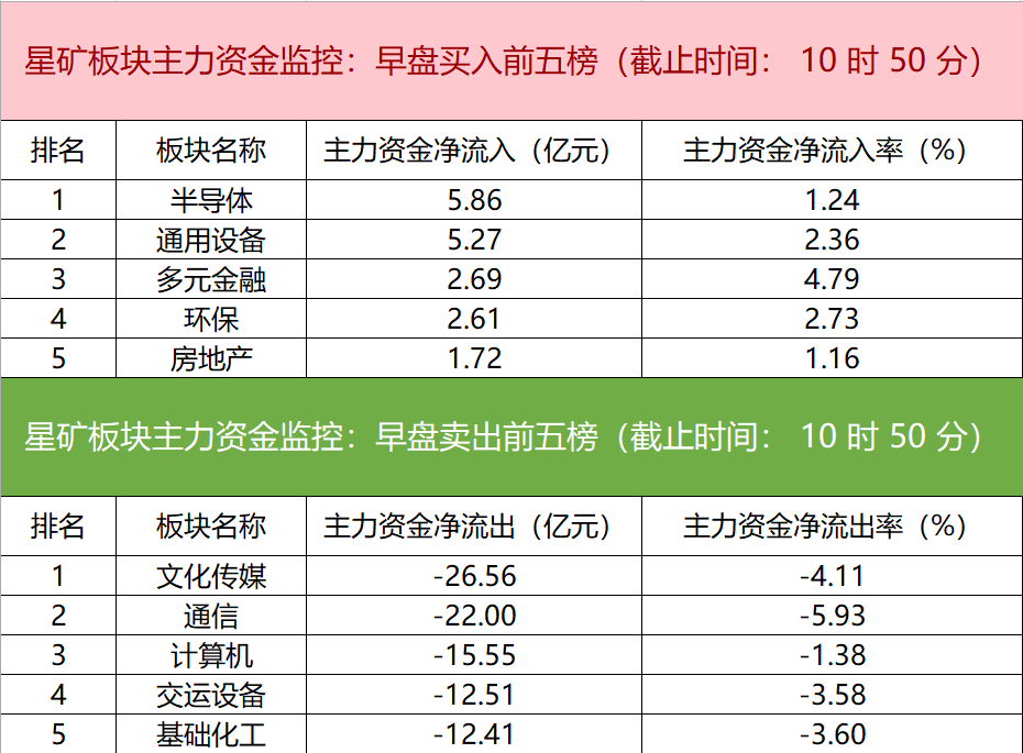 财联社11月28日电,财联社星矿数据显示,今日早盘主力资金净流入半导体、通用设备、多元金融等板块,净流出文化传媒、通信、计算机等板块,其中文化传媒板块净流出超26亿元。个股方面,中科曙光大涨,主力资金净买入5.11亿元位居首位,双良节能、人民网、方正科技获主力资金净流入居前;汤姆猫遭净卖出超10亿元,川发龙蟒、东方财富、三六零主力资金净流出额居前。