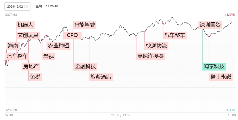 财联社12月3日电,市场早盘震荡拉升,午后维持高位震荡,三大指数均涨超1%。全市场超4600只个股上涨,逾200股涨停或涨超10%。沪深两市全天成交额1.79万亿,较上周五放量784亿。1)港股IP经济概念股名创优品前九月营收同比增长超22.5%,该股周一飙升18%,总市值逼近600亿港币。IP经济概念作为新消费代表继续站上风口,广博股份、新世界、齐心集团、永辉超市、元隆雅图等多股实现连板晋级,热度也继续扩散向同为年轻消费群体主导的宠物经济方向,天元宠物、源飞宠物双双涨停。2)机器人概念股在上周大面积爆发后整体维持高溢价,继续与指数形成共振,山东矿机、爱仕达、三丰智能、日发精机、中坚科技实现连板晋级,拓斯达、江苏雷利两只上周五20CM涨停股也继续大涨创出历史新高。3)美国今年的黑色星期五销售火爆,据Adobe Analytics统计,与前一年相比,AI聊天机器人为零售网站带来的流量增加了1800%。多重利好加持下跨境电商概念持续站上风口,跨境电商低价人气股跨境通一字涨停晋级4连板,带动南极电商、美邦服饰等纷纷跟随上板。4)据外交部消息,外交部和海南省人民政府将于12月4日下午举行海南自贸港全球推介活动。海南本地股迎来爆发,晋级5连板的葫芦娃在内的20只成分股涨停,占据整个板块中的七成以上个股。