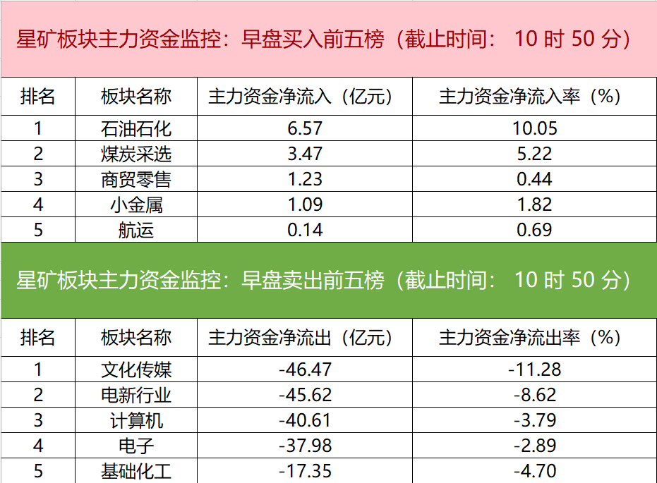 财联社12月4日电,财联社星矿数据显示,今日早盘主力资金净流入石油石化、煤炭采选、商贸零售等板块,净流出文化传媒、电新行业、计算机等板块,其中文化传媒板块净流出超46亿元。个股方面,永辉超市涨停,主力资金净买入6.29亿元位居首位,山子高科、机器人、中国石油获主力资金净流入居前;利欧股份遭净卖出超16亿元,南京化纤、粤桂股份、三六零主力资金净流出额居前。