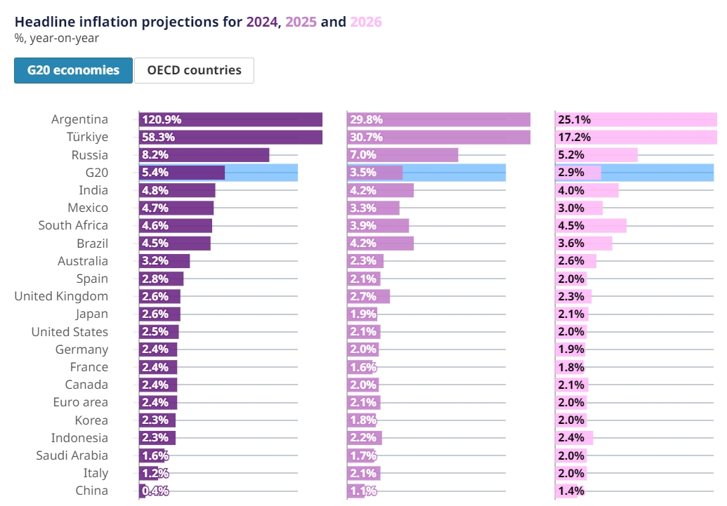 财联社12月4日电,经合组织发布的最新预测显示,到2024年,在食品、能源和商品价格通胀进一步下降的带动下,大多数国家的总体通胀持续缓解。然而,服务价格通胀仍在持续,9月份经合组织经济体的中位数约为4%。展望未来,G20国家的年度消费者价格通胀预计将进一步下降,到2025年底或2026年初,几乎所有剩余主要经济体的通胀预计将恢复到目标水平。