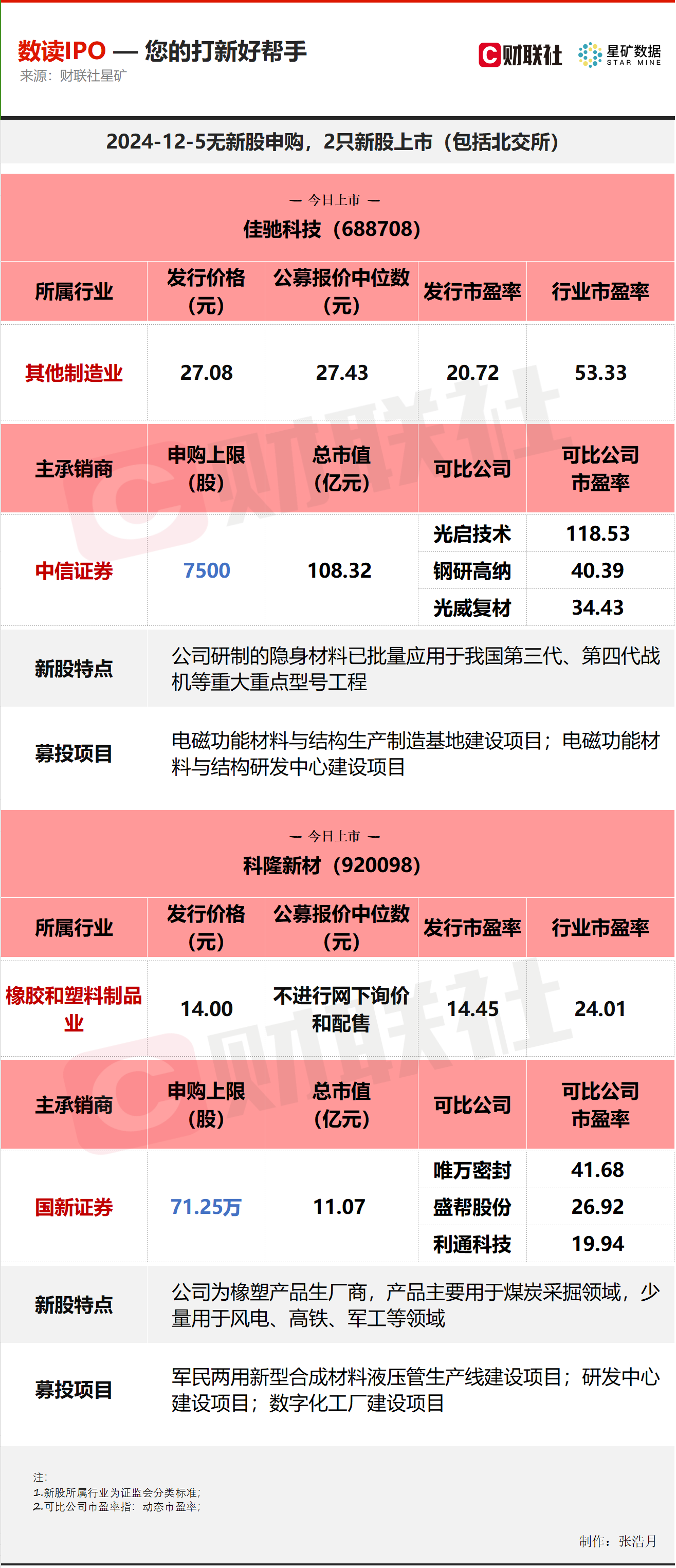 财联社12月5日电,今日无新股申购;2只新股上市,分别为科创板的佳驰科技,北交所的科隆新材。