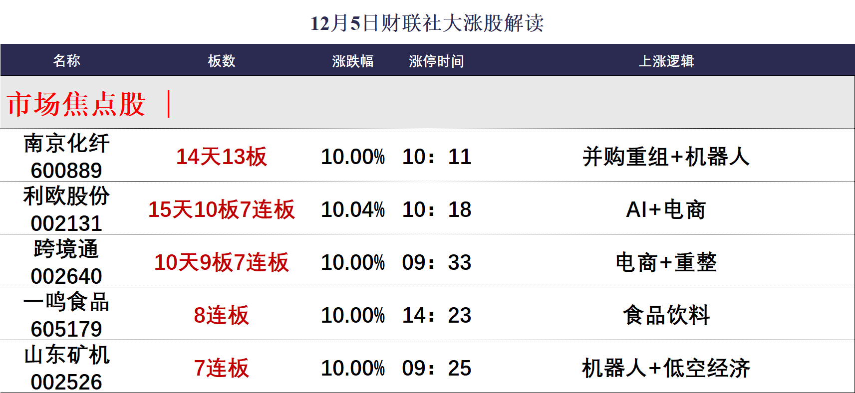 今日共114股涨停,连板股总数38只,25股封板未遂,封板率为82%(不含ST股、退市股)。焦点股方面,南京化纤涨停反包录得14天13板,AI应用端的利欧股份15天10板、跨境通10天9板,大消费板块一鸣食品8连板,机器人概念股山东矿机7连板。
