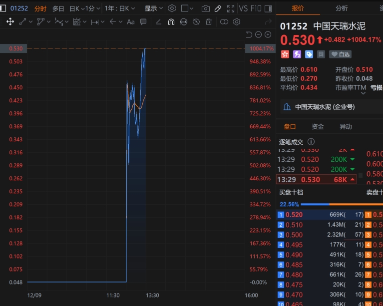 财联社12月9日电,港股中国天瑞水泥午后复牌涨1000%。该股票于2024年4月9日尾盘放量闪崩,收跌99.04%,停牌至今。