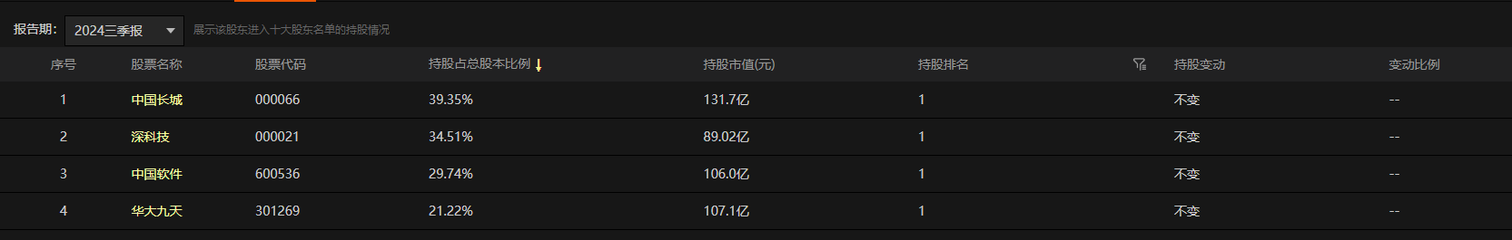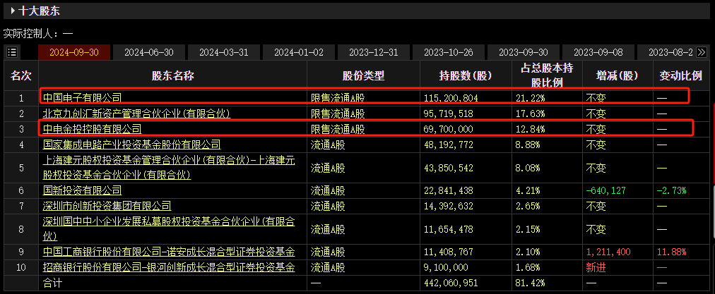小财注:官网显示,中国电子集团成立于1989年5月,是中央直接管理的以网信事业为核心主业的国有重要骨干企业,连续14年入选《财富》世界500强。截至公告披露日,中国电子集团通过其控股子公司中国电子有限公司(简称“中国电子有限”)、其全资子公司中电金投控股有限公司(以下简称“中电金投”)持有华大九天 1.85亿股股份,合计持股比例为 34.06%。其中,中国电子有限持有华大九天21.22%股份,为公司的第一大股东。除华大九天外,目前中国电子有限参股的上市公司还包括中国长城、深科技和中国软件。