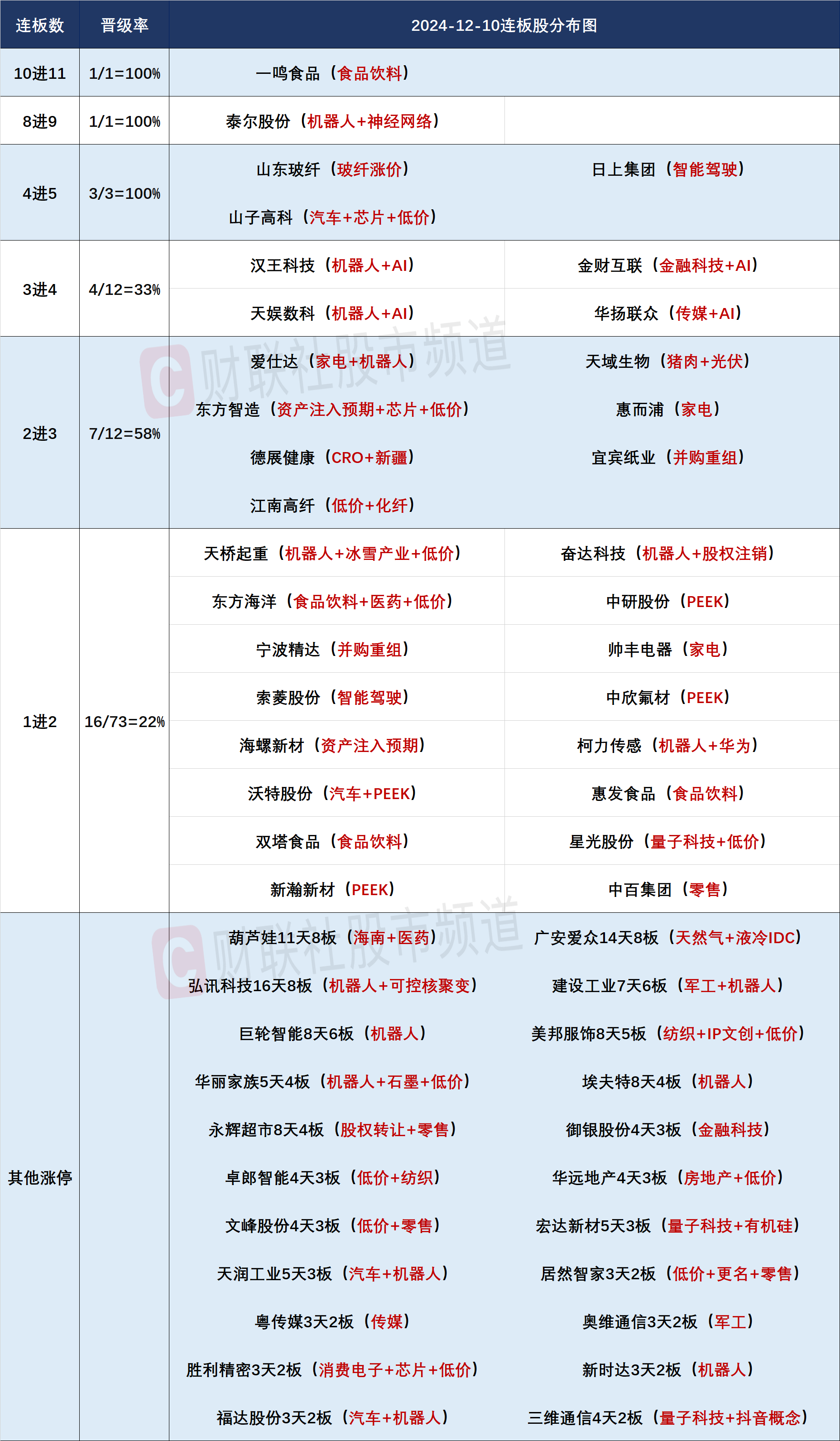 今日共112股涨停,连板股总数32只,其中三连板及以上个股16只,上一交易日共31只连板股,连板股晋级率51.61%(不含ST股、退市股)。个股方面,沪深两市从开盘不足50只个股下跌,到收盘时超2000只个股下跌,炸板率近40%,日内追涨亏钱效应明显。连板梯队断层,除了11连板的一鸣食品与9连板的泰尔股份外,剩余连板股最高仅5连板,表明后排个股掉队严重。板块方面,早盘非银金融、金融科技板块直接高开低走,表明市场暂时无力发动指数行情,资金转而选择近期最热门的机器人题材,机器人板块再度超30股涨停或涨超10%,柯力传感、巨轮智能等高位人气股悉数涨停,而除机器人外大部分热点均高开低走或冲高回落。