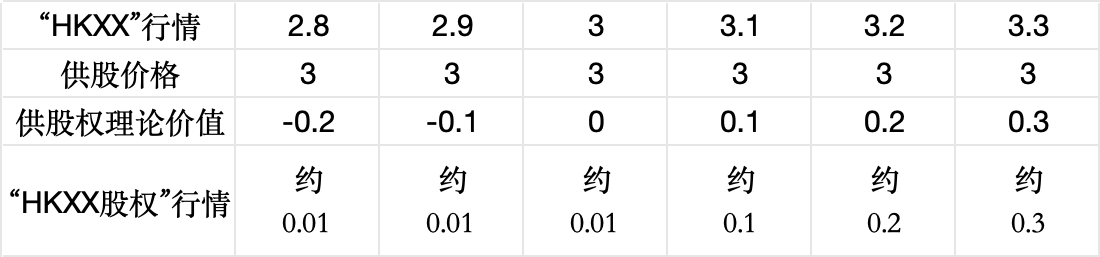 需要提醒注意的话,在供股行权日期内,“HKXX”股票也是会正常交易的,因此“HKXX”的价格会随时波动,这就又反过来会影响“HKXX股权”的价格随时波动。我们用下面的表来演绎一下这种价格关系(单位:港元):