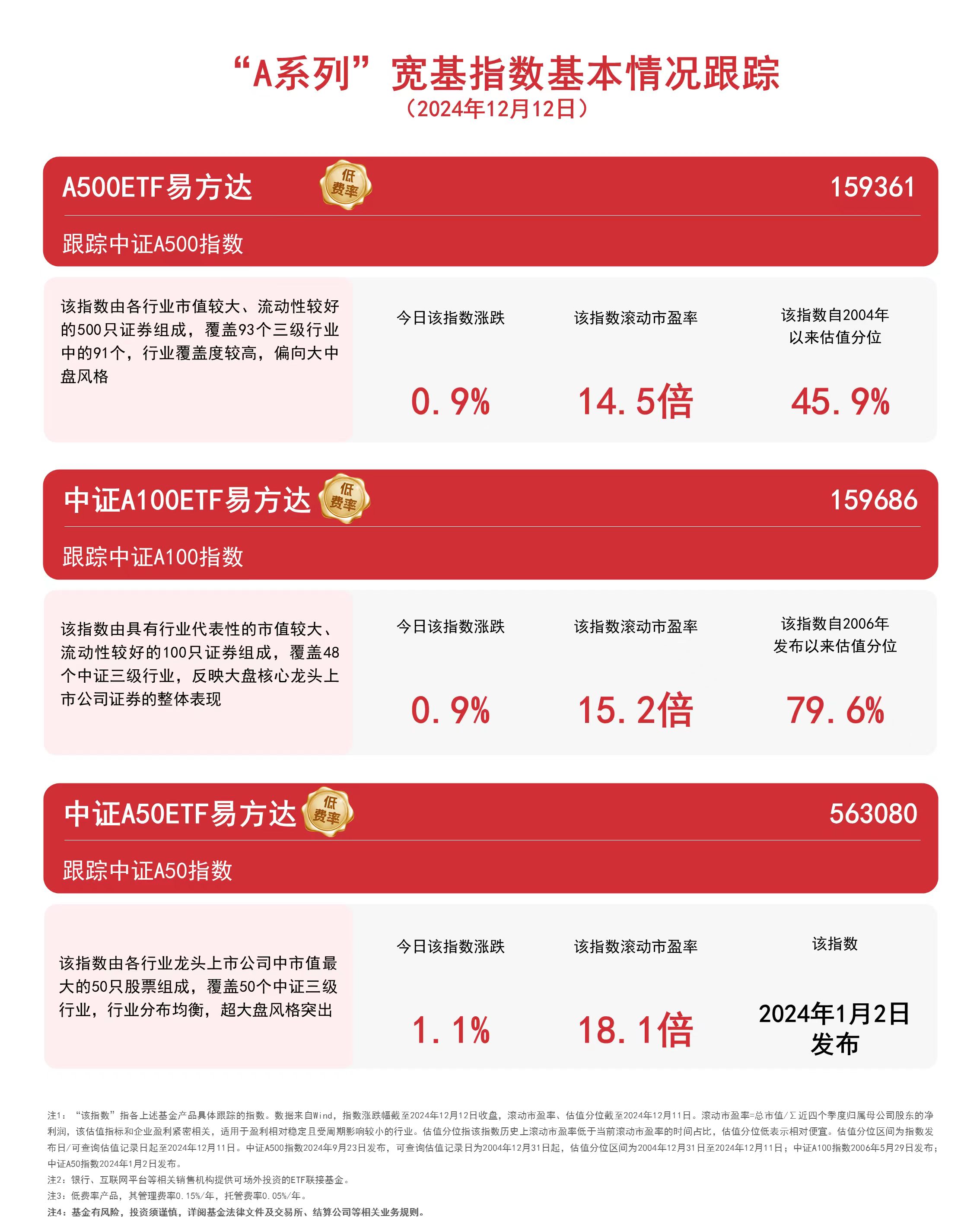 截至收盘,今日中证A500指数上涨0.9%,中证A50指数上涨1.1%,中证A100指数上涨0.9%。今日,易方达基金旗下11只指数基金增设Y份额,新纳入个人养老金基金,包括易方达中证A500ETF联接Y(022930)、易方达中证A50ETF联接Y(022892)等。