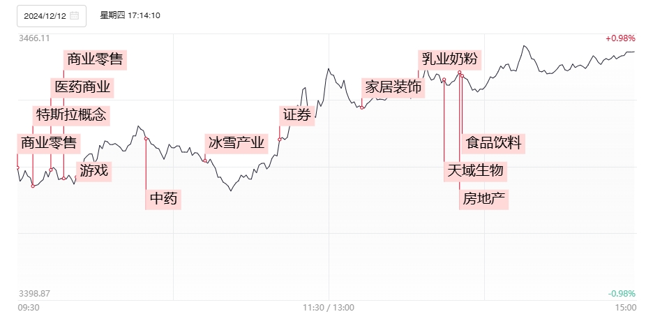 财联社12月13日电,市场全天震荡走高,创业板指领涨。全市场超3500只个股上涨,逾150股涨停或涨超10%。沪深两市全天成交额1.87万亿,较前日放量905亿。1)近期多地的刺激消费政策层出不穷,大消费板块中“衣食住行”几大方向悉数迎来爆发,胖东来概念人气股中百集团和永辉超市继续双双涨停,一鸣食品尽管止步12连板,但惠发食品等多只低位连板股继续实现晋级。此外作为新消费范畴的冰雪旅游以及IP经济等也轮番活跃。2)抖音豆包概念表现如期分化,前排个股三维通信、省广集团、引力传媒、视觉中国继续实现连板晋级,豆包玩具相关的消费电子以及AI玩具方向随着移远通信的炸板回落而整体表现较为沉闷。3)机器人产业链在大消费、大金融两大方向资金分流作用下同样呈现分化,五洲新春、巨轮智能等高标股在日内巨震分歧后完成转一致上板,高标股建设工业尾盘快速炸板后迅速回封继续实现换手板晋级,其持续实现晋级或继续驱动军工机器人方向涌现出新的低位品种。4)国盛金控继续超预期以T字板晋级,带动券商板块11点后展开一波放量拉升,国联证券涨停、西南证券一度逼近涨停。互联金融、金融科技方向则仍是大金融板块中的高弹性方向,盘中首批指数基金纳入个人养老金投资产品目录的消息则刺激君正集团等多只参股基金公司个股午后上板。