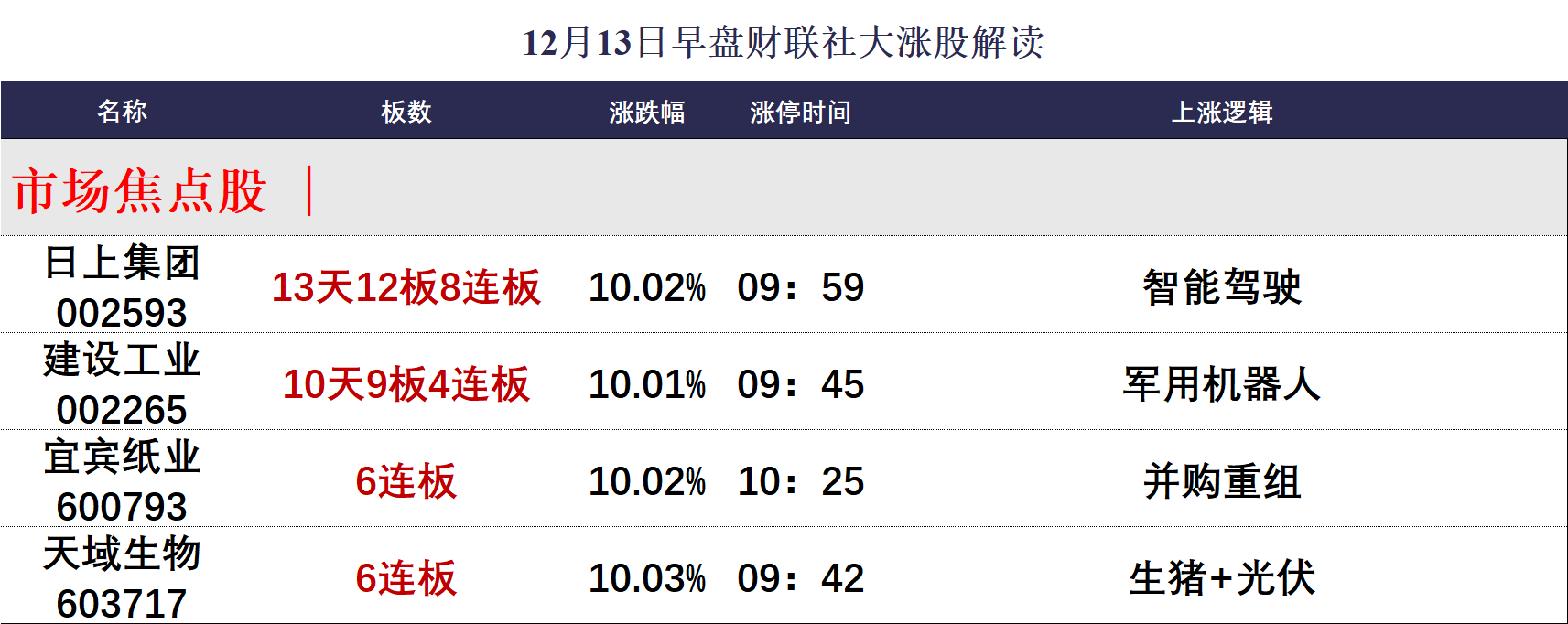 财联社12月13日电,今日午盘全市场共79股涨停,连板股总数27只,27股封板未遂,封板率为74%(不含ST股、退市股)。焦点股方面,日上集团13天12板8连板领涨,山东玻纤炸板后大幅跳水跌近6%, 一鸣食品跌停;首发经济概念大涨,利亚德、米奥会展、锋尚文化等20CM涨停。