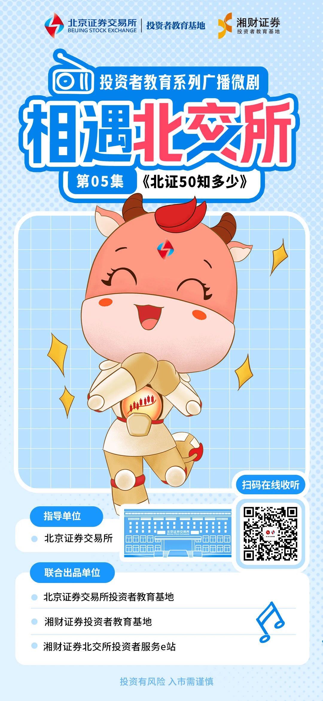 为深入贯彻落实党的二十届三中全会精神和新“国九条”关于投资者保护的相关决策部署,牢固树立金融为民理念,培育理性投资文化,提升投资者风险防范意识,在我所组织开展的 “合规交易 理性参与”投教活动期间,我们特推出投教系列广播微剧《相遇北交所》,向投资者普及北交所市场交易相关知识。本期介绍北证50指数相关内容,快来一起听听吧!