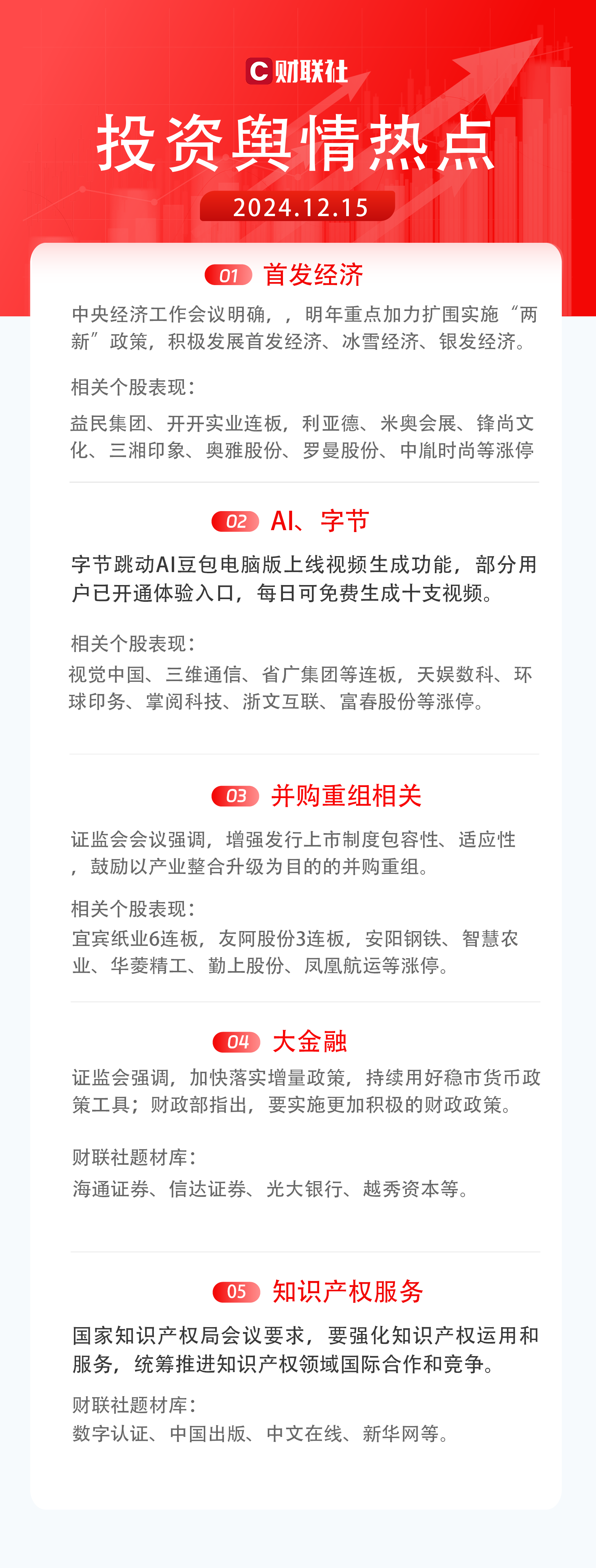 4)大金融:证监会会议强调,加快落实增量政策,持续用好稳市货币政策工具;央行研究局局长王信称,将适时降准降息,加大货币信贷投放力度;财政部会议指出,明年要实施更加积极的财政政策,确保财政政策持续用力、更加给力。