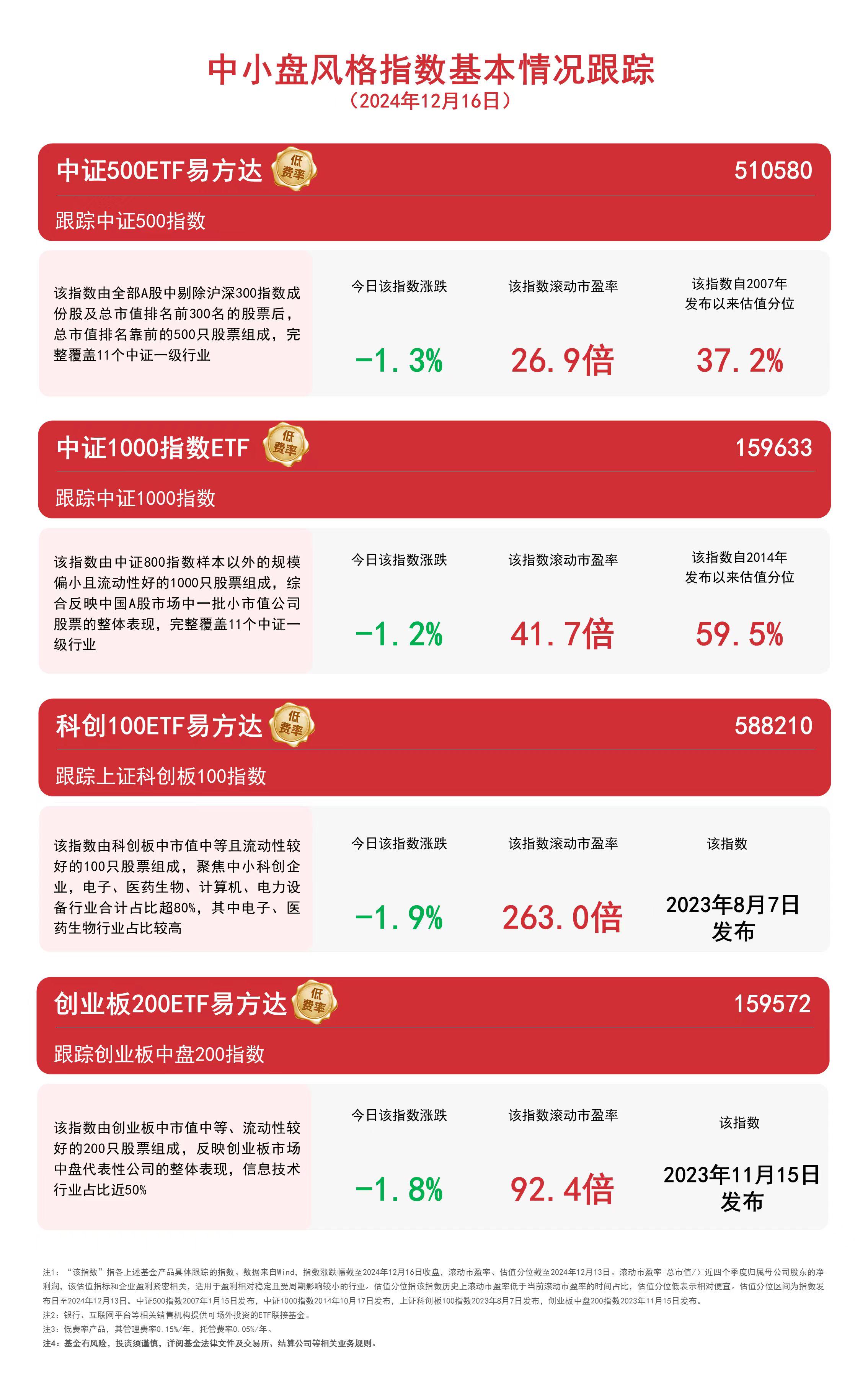 中小盘风格指数走弱,中证500ETF易方达(510580)、中证1000指数ETF(159633)等产品布局优质中小企业