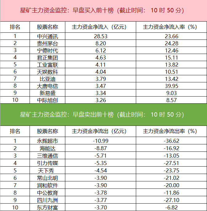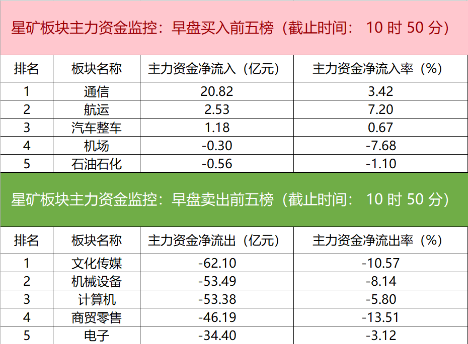 财联社12月17日电,财联社星矿数据显示,今日早盘主力资金净流入通信、航运、汽车整车等板块,净流出文化传媒、机械设备、计算机等板块,其中文化传媒板块净流出超62亿元。个股方面,中兴通讯一度涨停,主力资金净买入28.53亿元位居首位,贵州茅台、宁德时代、君正集团获主力资金净流入居前;永辉超市遭净卖出超10亿元,海能达、三维通信、引力传媒主力资金净流出额居前。