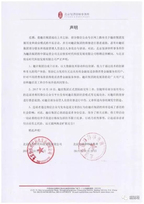 对此,今日下午趣店发布官方声明,称上市之际,部分微信公众号散布不实言论,对其商誉造成不良影响,以保全相关数据,将启动法律手段进行维权。