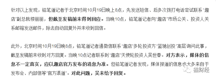 作者在截稿前曾向多方求证,仅联系到“趣店”天使轮投资人吴世春。对方表示,媒体的信息不一定真实,应以趣店官方发布的消息为准。其余各方均未得到回应。