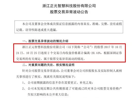 财联社注意到,在昨日(25日)正元智慧(sz300645)出现“一字停”的状态后,正元智慧科技股份有限公司于当日19时48分发布了《股票交易异常波动公告》。公告称:浙江正元智慧有限公司的股票2017年10月24日、10月25日连续两个交易日收盘价累计偏离-20.44%。公司核实后,排除了隐瞒信息,无重大新闻报道,经营环境、公司股东、公司实际控制人变化等因素。