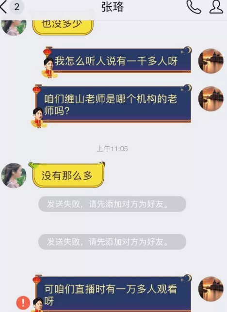 财联社通过“东方港湾股票群009”加上了名为“张珞”的缠山助理,在聊到“缠山老师是哪个机构的老师时”,未得到回应且被拉黑。