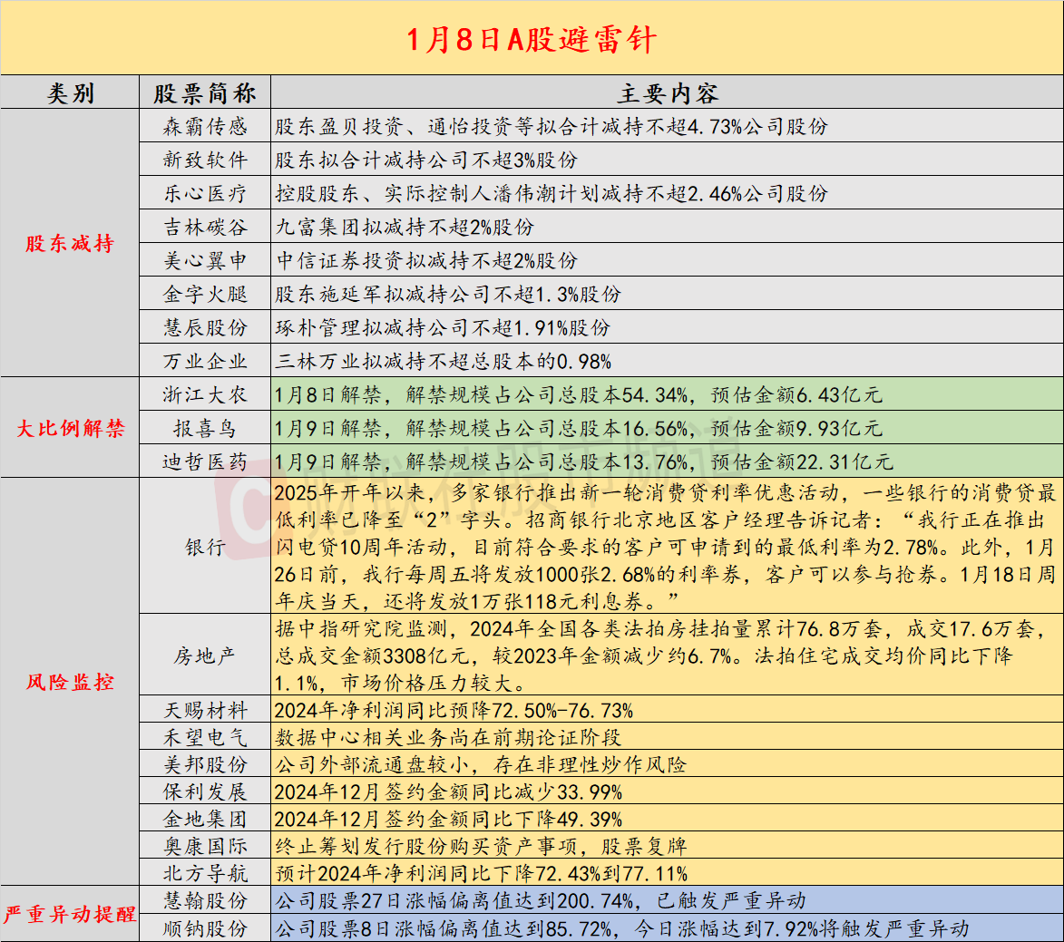 昨日公告的A股拟减持的公司数量较之前有所增多,森霸传感股东盈贝投资、通怡投资等拟合计减持不超4.73%公司股份,新致软件股东拟合计减持公司不超3%股份;浙江大农将迎来超五成以上解禁;温州严查哄抬抗流感药物价格行为;天赐材料2024年净利润同比预降72.50%-76.73%;消费贷价格战再起,利率降至“2”字头;2连板禾望电气公告,数据中心相关业务尚在前期论证阶段;纳指收跌近1.9%,英伟达大跌6%。
