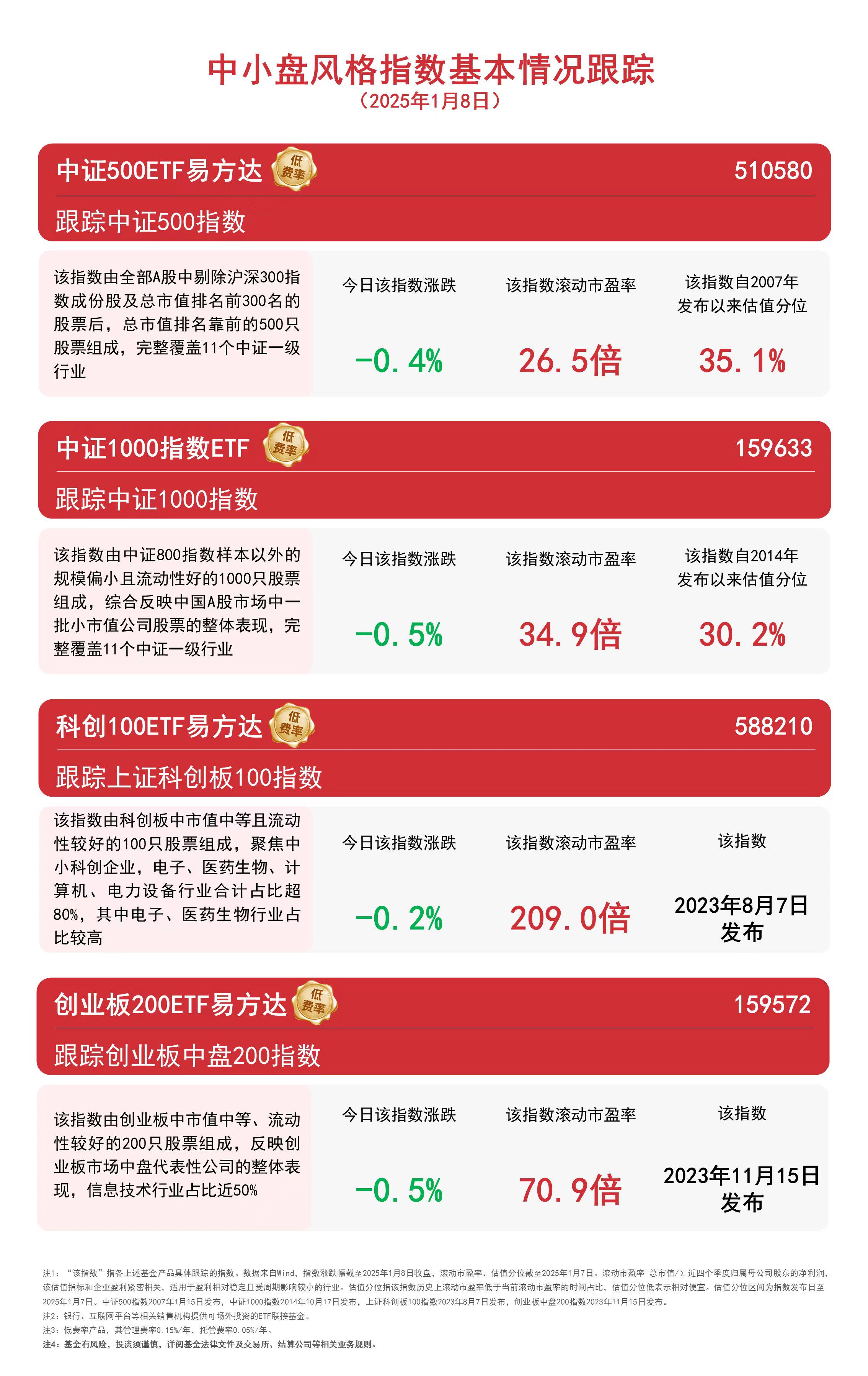政策加强对科技型中小企业的金融支持,科创100ETF易方达(588210)、创业板200ETF易方达(159572)等跟踪中小盘风格指数的产品受关注,可助力投资者低成本布局中小企业发展机遇。