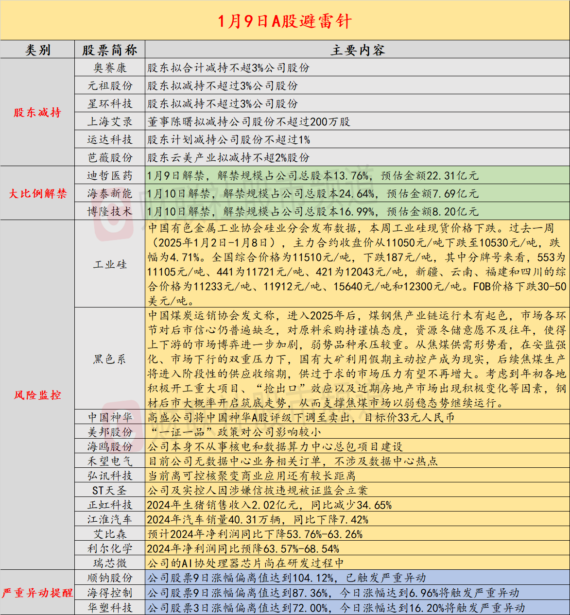 昨日公告的A股拟减持的公司数量较之前有所减少,奥赛康股东拟合计减持不超3%公司股份,元祖股份股东拟减持不超过3%公司股份;海泰新能将迎来超二成以上解禁;硅业分会发布数据,本周工业硅现货价格下跌;高盛公司将中国神华A股评级下调至卖出,目标价33元人民币;中国煤炭运销协会发文,煤钢焦产业链未有起色,弱势品种承压较重;5连板美邦股份提示风险,“一证一品”政策对公司影响较小;美股三大指数收盘涨跌互现,芯片股走低。