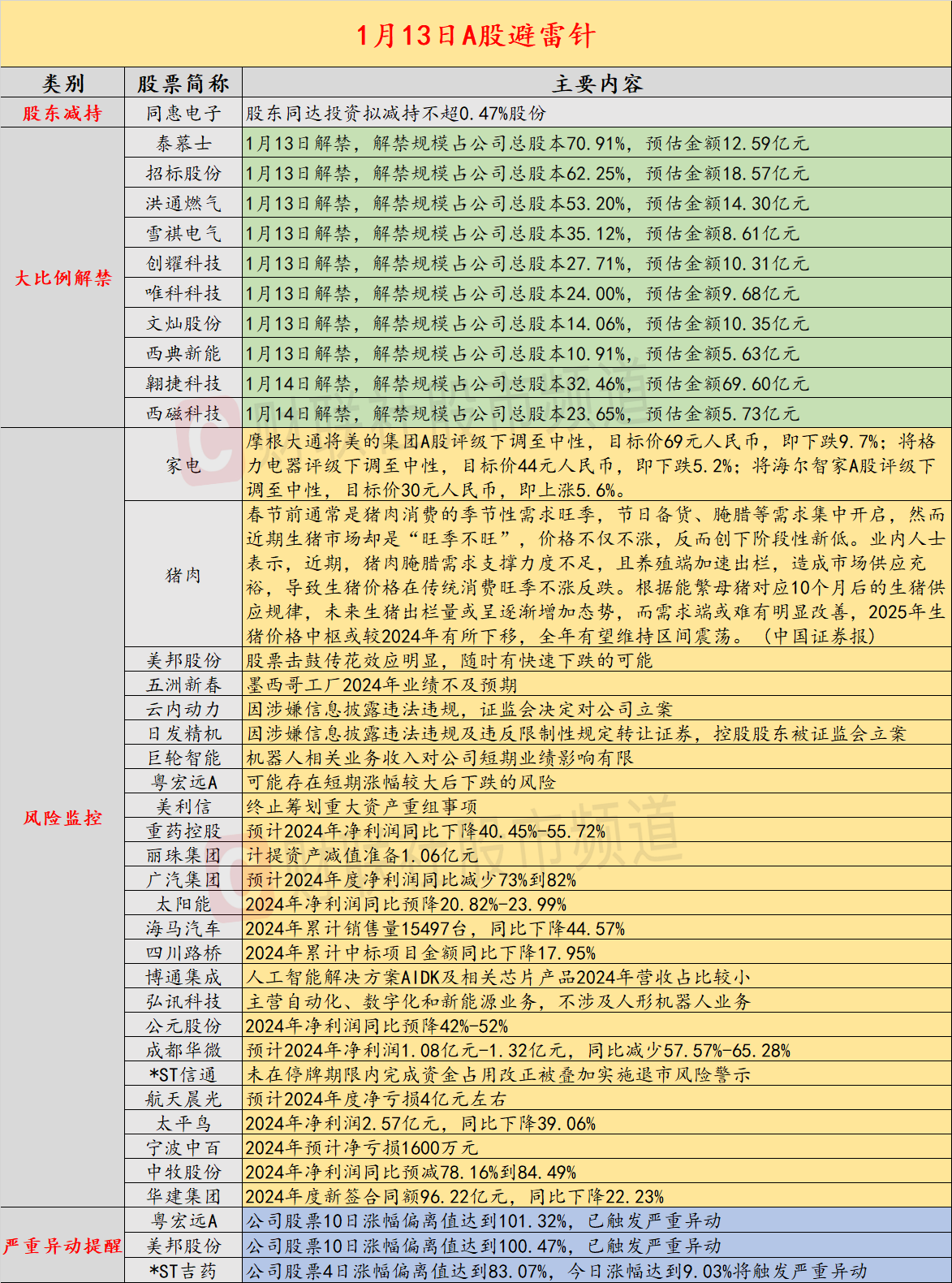 近日公告的A股拟减持的公司数量较之前有所减少,同惠电子股东同达投资拟减持不超0.47%股份;泰慕士、招标股份将迎来超六成以上解禁;国家卫健委表示,近期流感未超过上一年流行季水平;7连板美邦股份提示,股票击鼓传花效应明显,随时有快速下跌的可能;摩根大通下调多家中国家电企业评级;云内动力因涉嫌信息披露违法违规,证监会决定对公司立案;美国强劲就业数据打压宽松押注,上周五美股三大指数均收跌超1.5%。