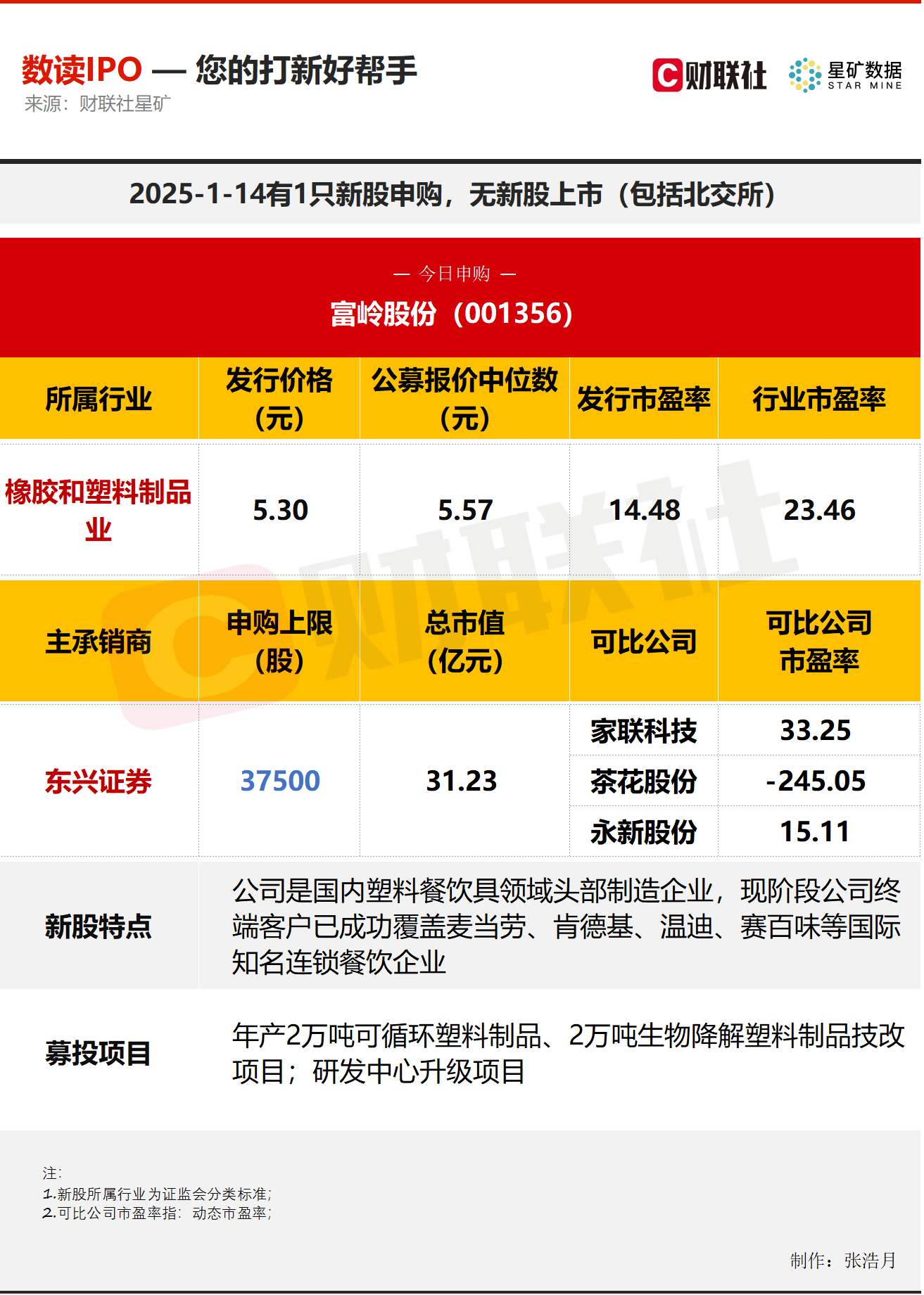 财联社1月14日电,今日有1只新股申购,为深交所的富岭股份;无新股上市。富岭股份是国内塑料餐饮具领域头部制造企业。