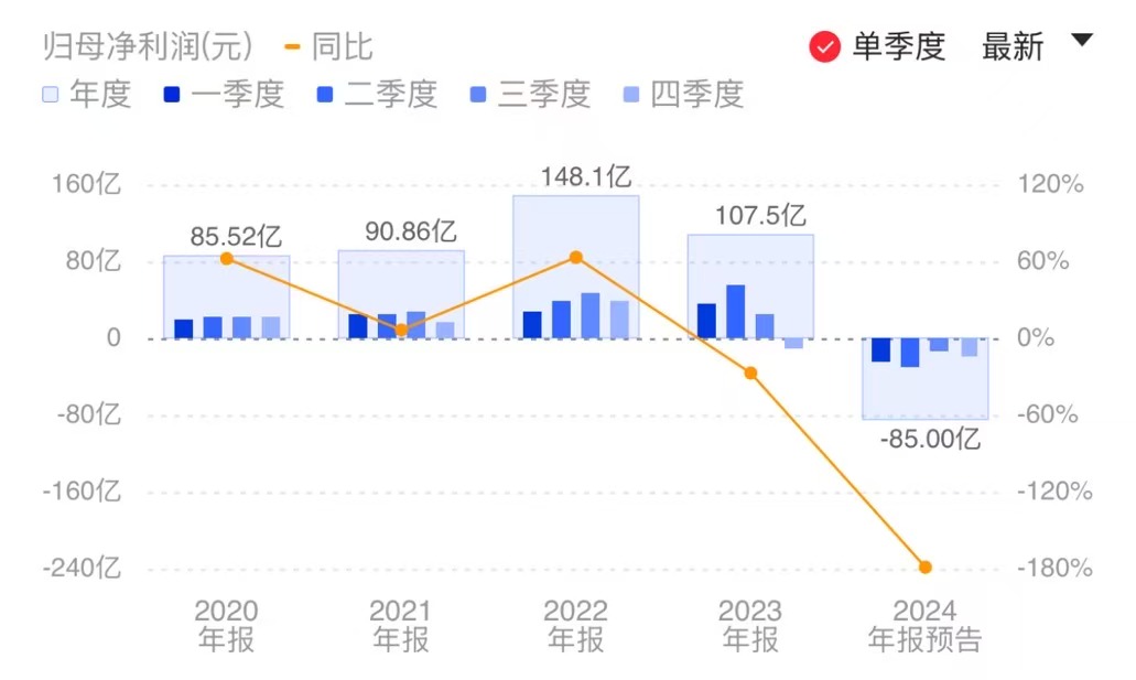 财联社1月16日电,隆基绿能公告,预计2024年度实现归属于上市公司股东的净亏损为82亿元到88亿元,与上年同期相比,将出现亏损,上年同期盈利107.51亿元。报告期内,受行业竞争加剧的影响,公司BC二代产品产量占比很低,PERC和TOPCon产品价格和毛利率持续下降,产能开工率受限,技术迭代导致计提资产减值准备增加,参股硅料企业投资收益产生亏损,导致经营业绩出现阶段性亏损。小财注:Q3净亏损12.61亿元,据此计算,Q4净亏损16.95亿元至22.95亿元。