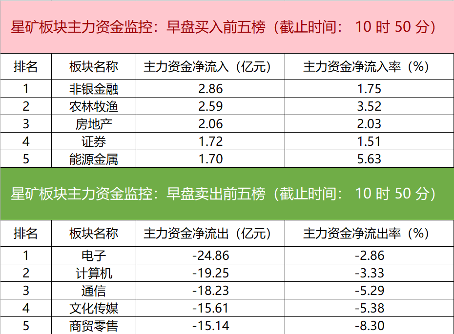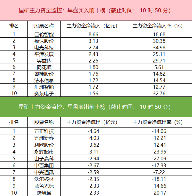 财联社1月17日电,财联社星矿数据显示,今日早盘主力资金净流入非银金融、农林牧渔、房地产等板块,净流出电子、计算机、通信等板块,其中电子板块净流出超24亿元。个股方面,巨轮智能大涨,主力资金净买入8.66亿元位居首位,福达股份、电光科技、平潭发展获主力资金净流入居前;方正科技遭净卖出超4亿元,五洲新春、利欧股份、永辉超市主力资金净流出额居前。
