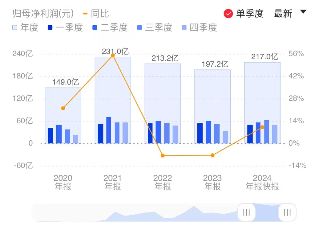 财联社1月17日电,中信证券公布2024年度业绩快报,公司实现营业收入637.89亿元,同比增长6.19%;归属于母公司股东的净利润217.04亿元,同比增长10.06%。加权平均净资产收益率8.09%,增加0.28个百分点。2024年12月31日,资产总额1.71万亿元,同比增长17.79%;归属于母公司股东权益2931.09亿元,同比增长9.03%;总股本1.48万;归属于母公司股东的每股净资产19.78元/股,同比增长9.04%。2024年,公司持续提升服务实体经济质效,加快建设一流投资银行和投资机构,将“功能性”放在首要位置,扎实做好金融“五篇大文章”,高质量服务新质生产力和居民财富管理,各项业务稳健发展。小财注:Q3净利62.29亿元,据此测算,Q4净利49.04亿元,环比下降21.27%。