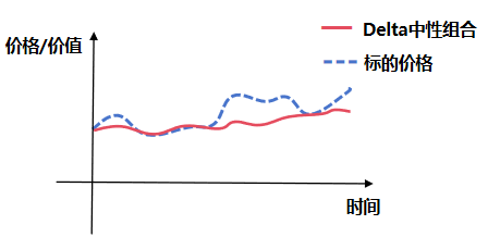 从外在表现上来说,Delta中性与市场中性有相似之处。对证券市场稍有了解的投资者或多或少听过市场中性的概念,其核心是对冲市场整体的风险,使组合回报与市场走势无关。Delta中性也是这样一种状态——组合价值的走势与标的价格的变动基本不相关,如下图所示。