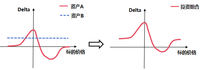 从理论上来说,根据实际需要,我们可以为任意一个资产计算一个特定标的的Delta敞口。但扩展到资产组合上,不同资产的Delta应该通过什么方式合成投资组合的Delta呢?直接相加——答案很符合直觉。回想Delta的定义就能很快得出这一结论:假设标的价格变动一个单位,一个资产的价值变动Δ1个单位,而另一个资产的价值变动Δ2个单位,那么由这两个资产组成的投资组合的价值变动理所当然是(Δ1+Δ2)个单位。
