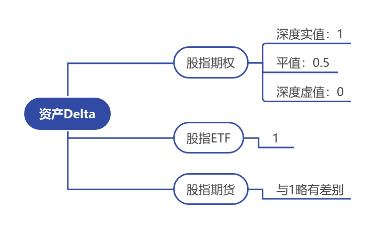 以上证50指数为例:一张场内平值的上证50股指期权Delta大概是0.5左右;对应标的的现货资产上证50ETF,净值变动基本与指数一致,其Delta大概是1左右;对应的期货上证50股指期货,由于升贴水的存在,价格并不完全按照指数变动,其Delta与1略有差别。