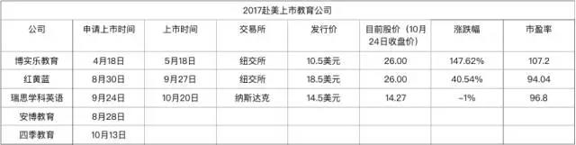 近期,美股市场表现强劲。目前已经有博实乐教育、红黄蓝、瑞思学科英语先后赴美上市,安博教育、四季教育则分别于8月与10月递交了上市申请书,涉及幼教、K12培训、英语培训、职业教育等细分领域。值得一提的是,其中的安博教育是第二次申请美股上市,它曾于2010年8月在美国纽交所挂牌上市,2014年5月退市。