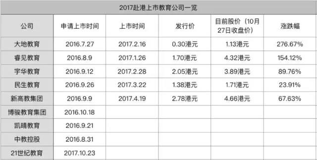 可以看到,这几家公司在港上市后,股价均表现不错,比如睿见教育发行价1.70港元,10月27日收盘价为4.32港元,涨幅达154.12%;宇华教育发行价2.05港元,10月27日收盘价为3.89港元,涨幅达89.76%。